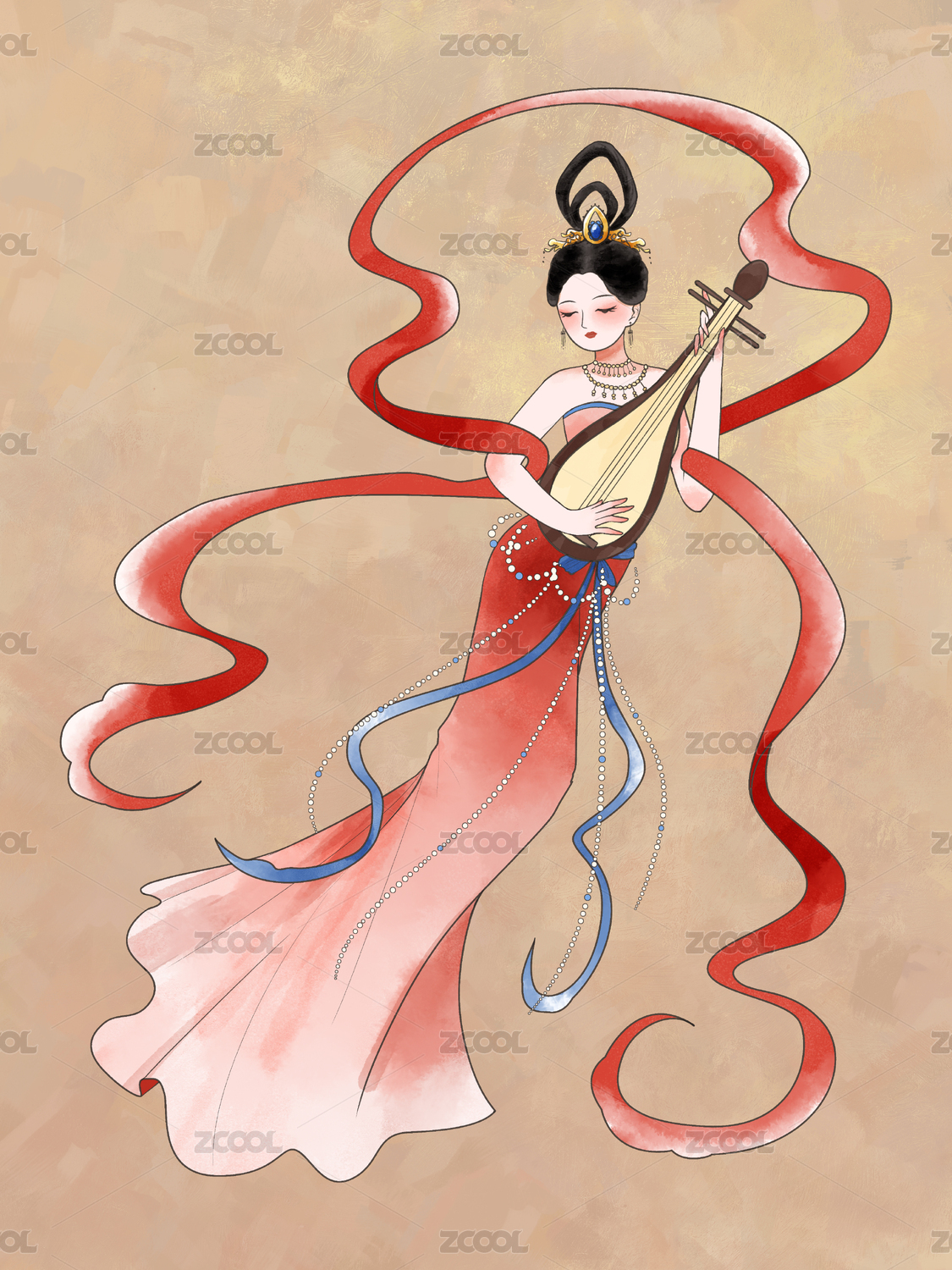 河边怀抱乐器的唐朝美女和锦鲤国风插画