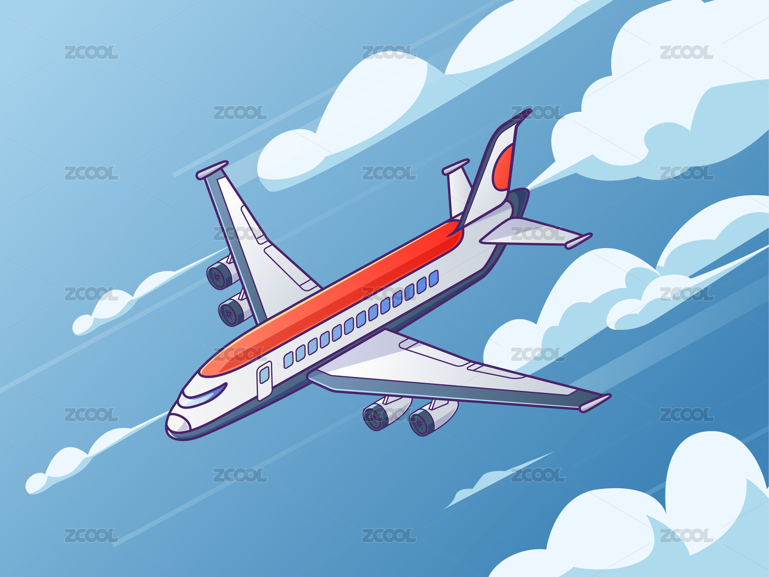 飞机,卡通,插画,3D,插图,橙色,白色,天空,交通,旅行