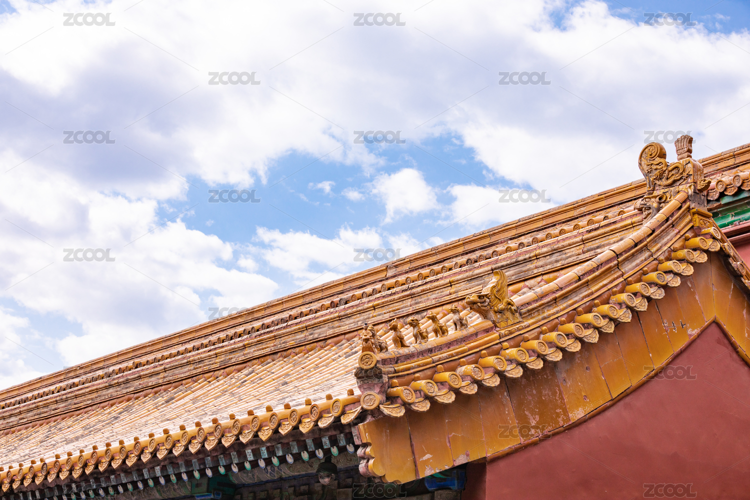 蓝天白云下北京故宫的歇山顶、红墙黄瓦