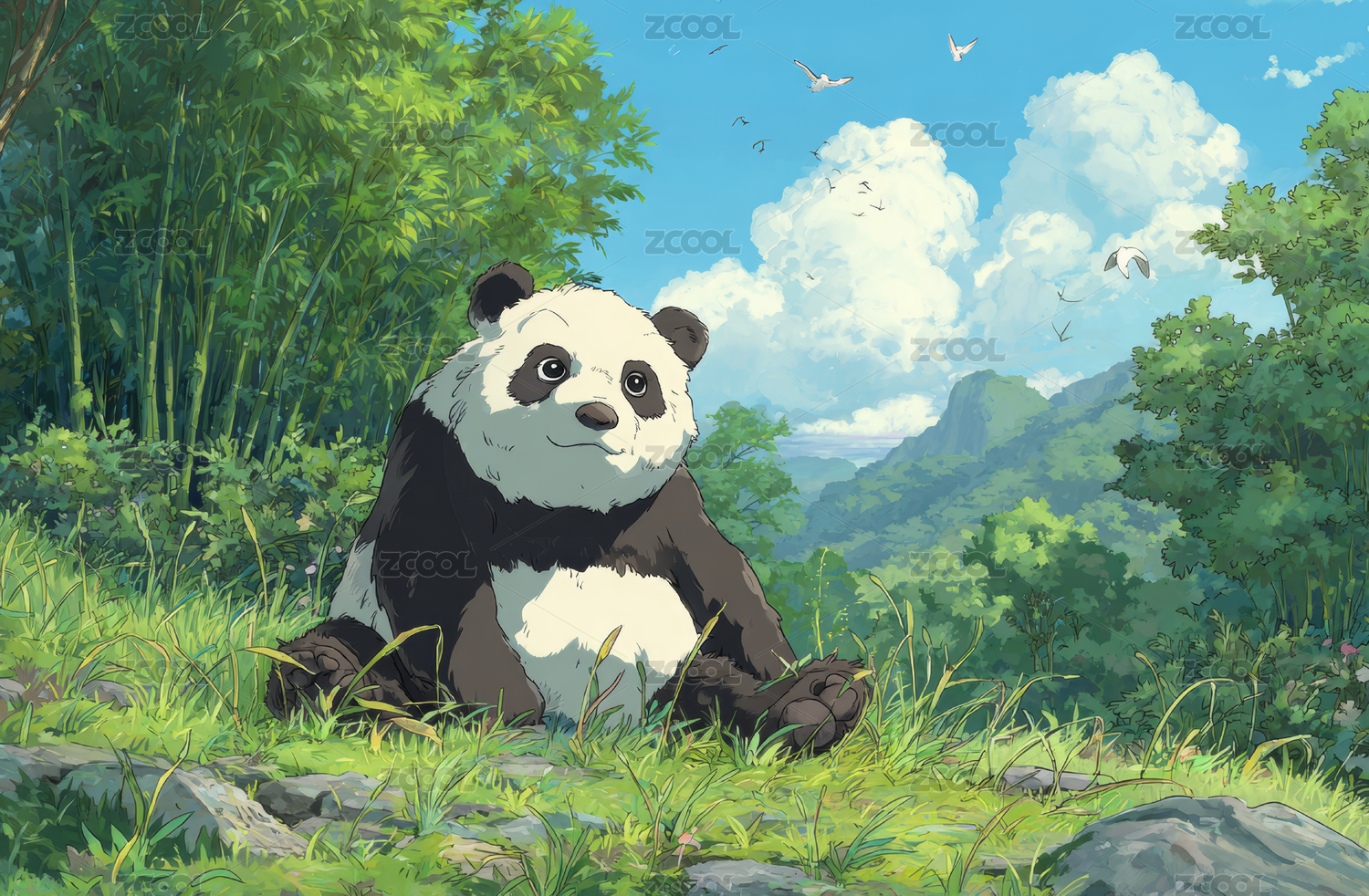 日漫动物熊猫拟人吉卜力宫崎骏风格插画