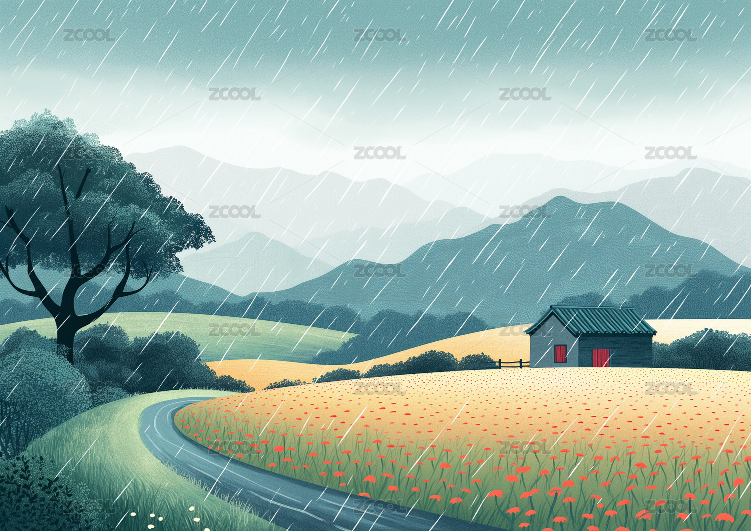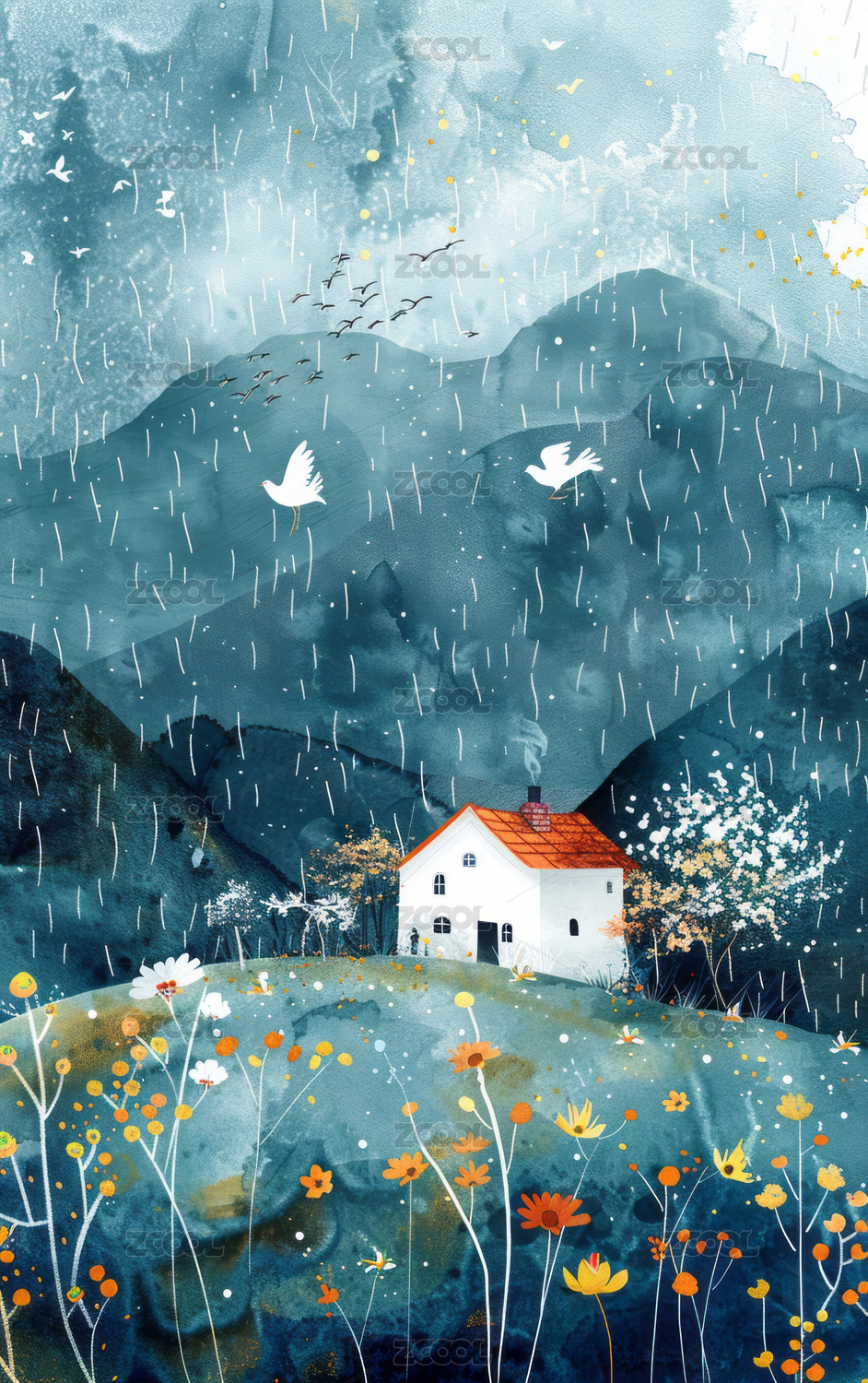 春雨落在房子鲜花草地上扁平肌理插画