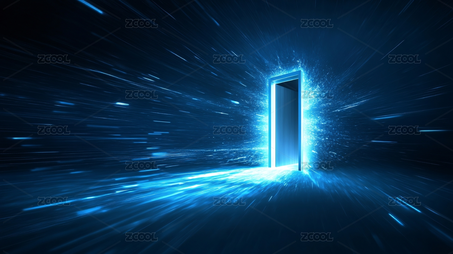 蓝色光影空间里神秘的发光门洞