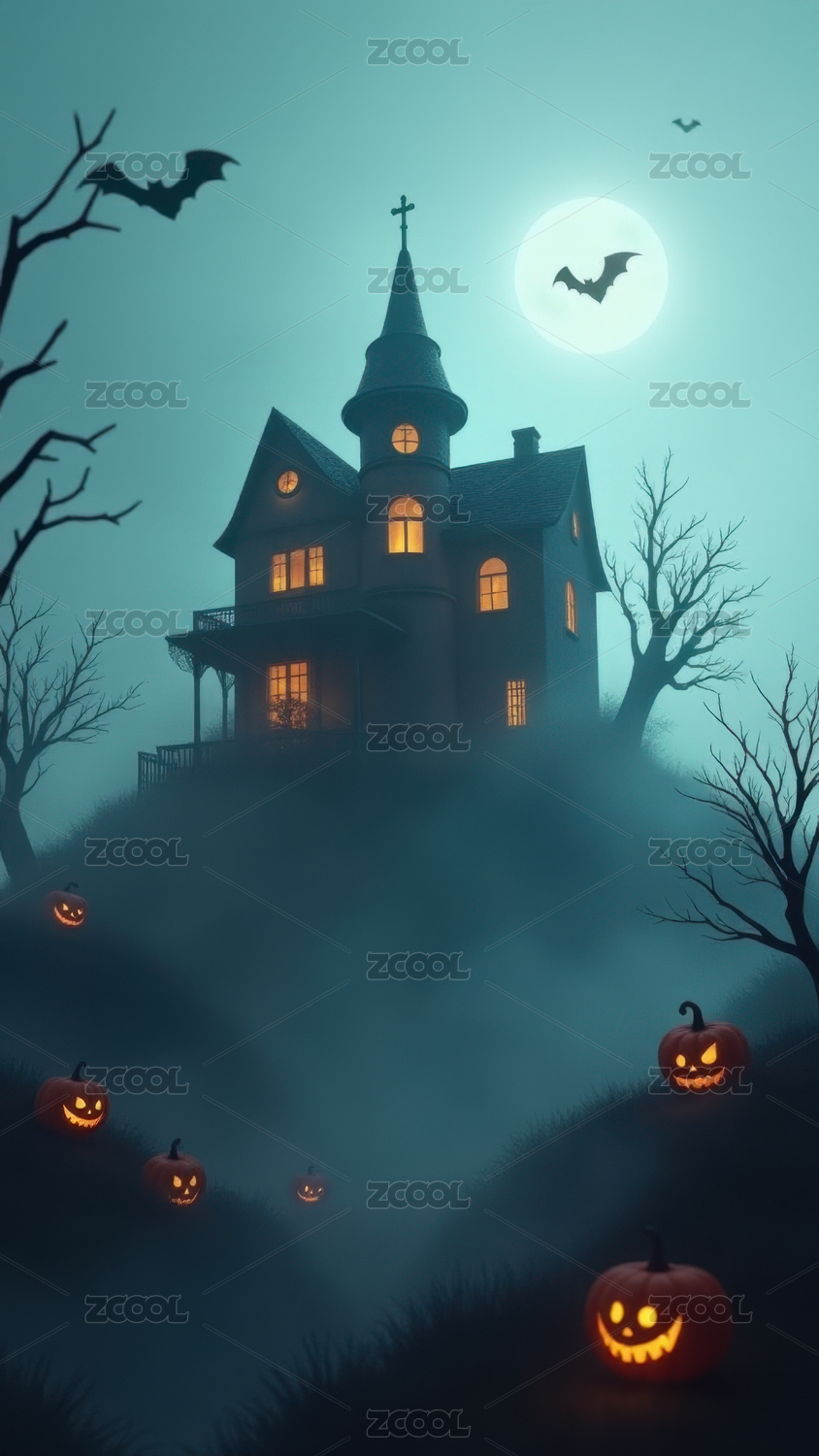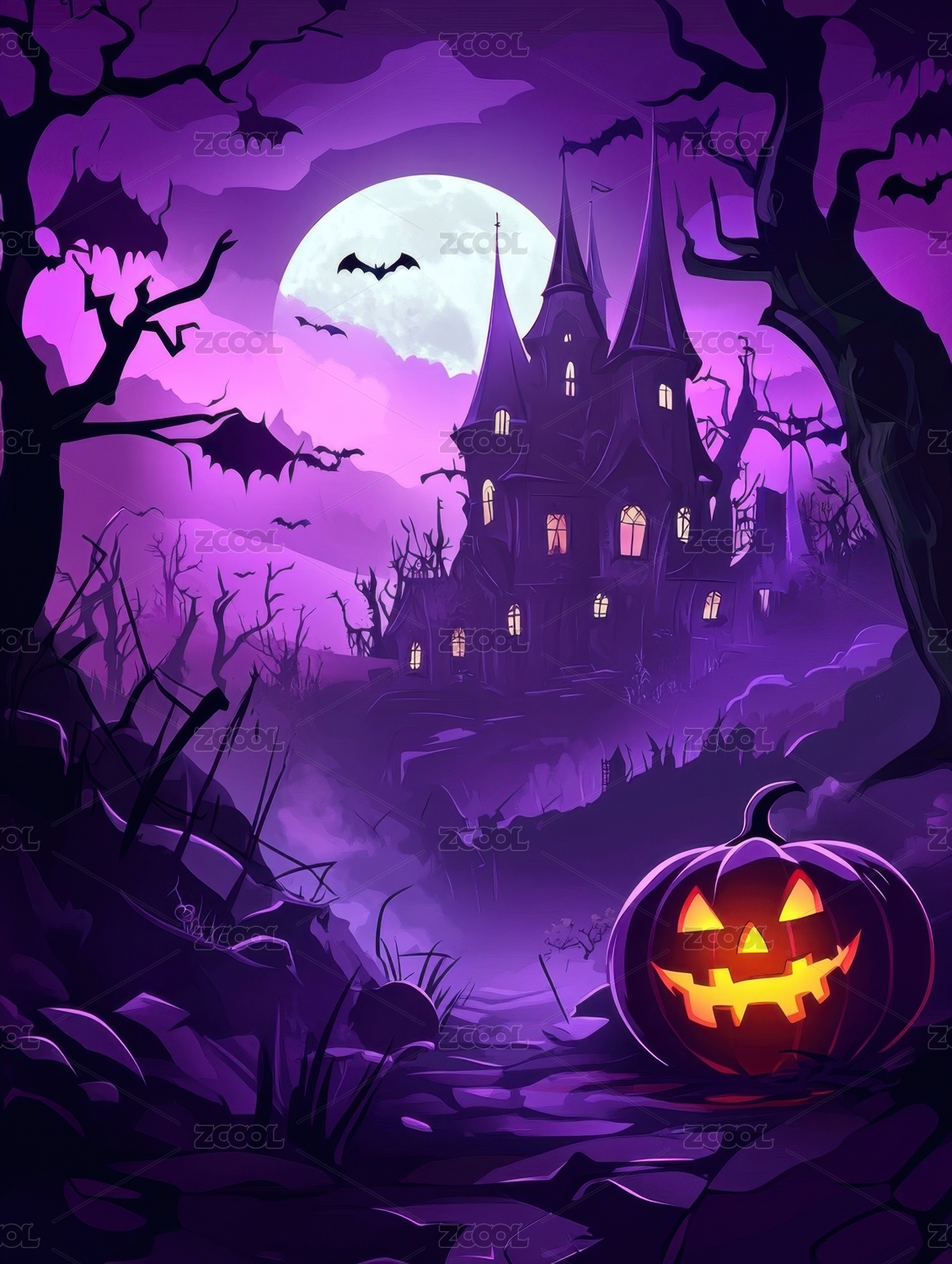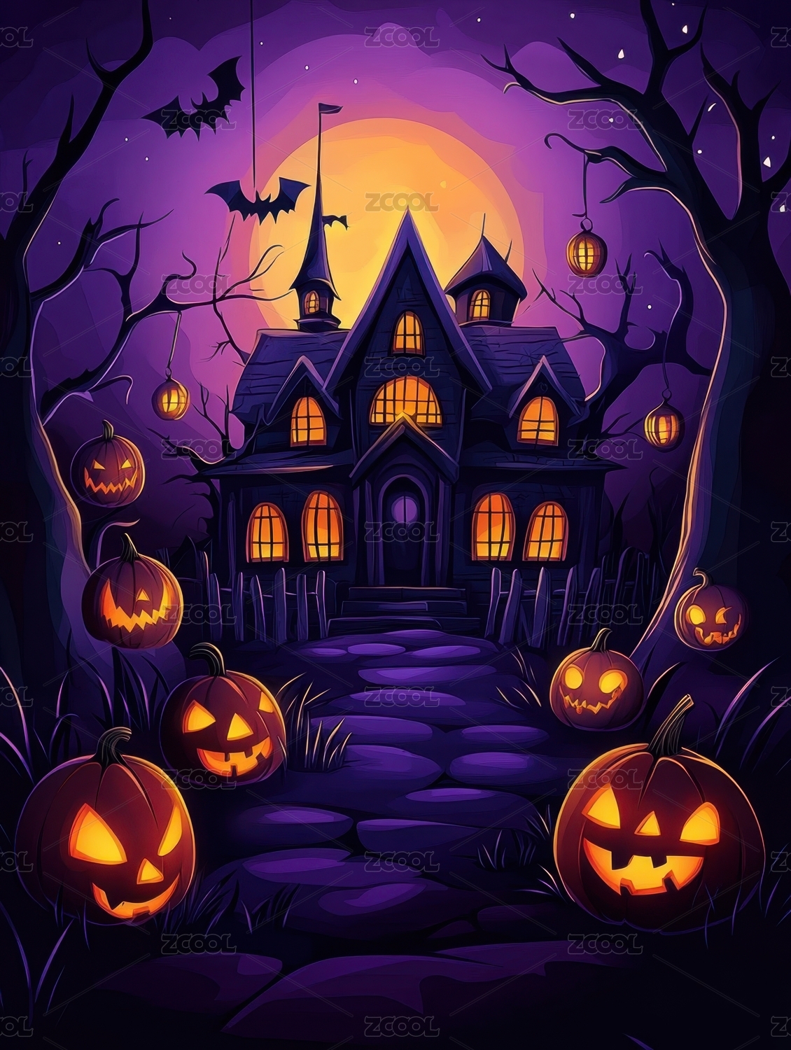 万圣节恐怖房屋夜晚城堡复古装饰节日插画