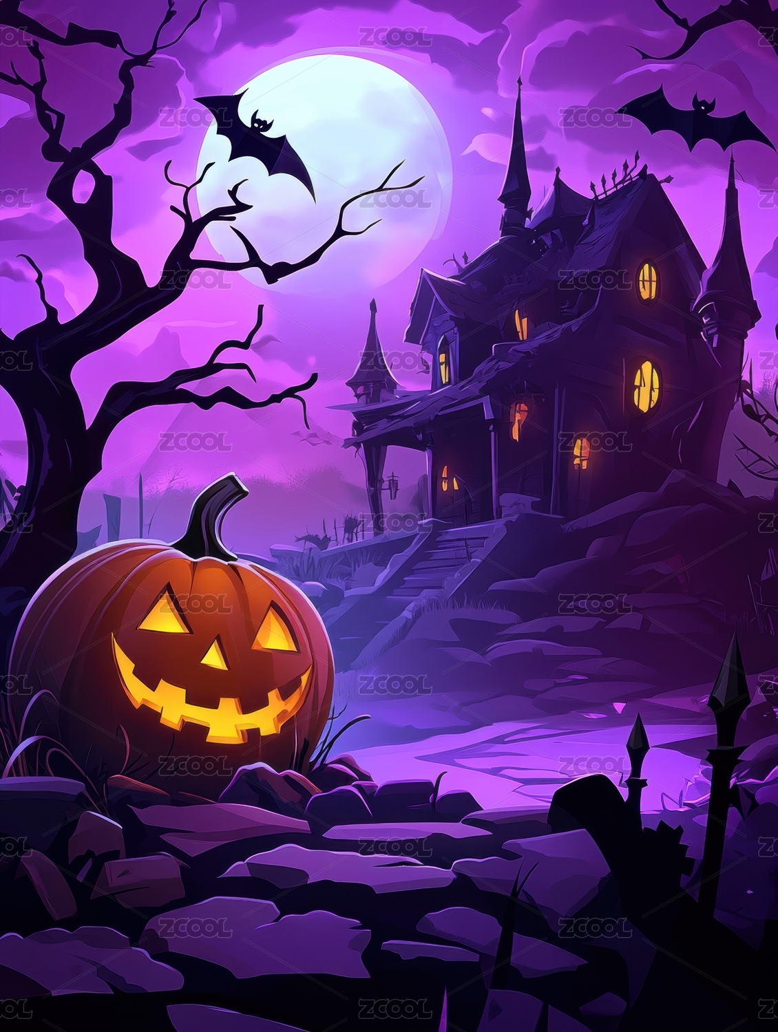 万圣节,插画,南瓜,城堡,夜晚,月亮,怪异,墓地,坟墓,剪影