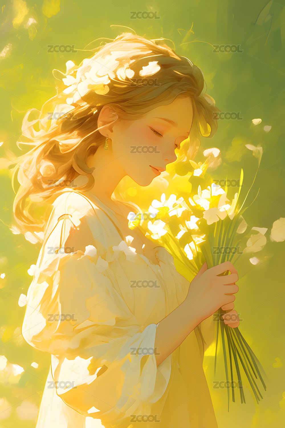 女孩手捧花束沐浴在金色阳光中
