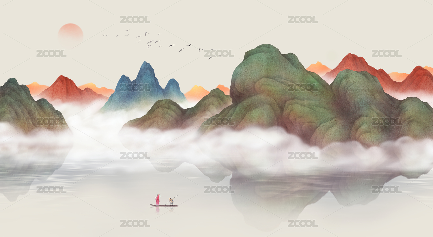 插画,山水,山水画,水墨画,山脉,风景,鸟类,装饰画,新中式风格,国风