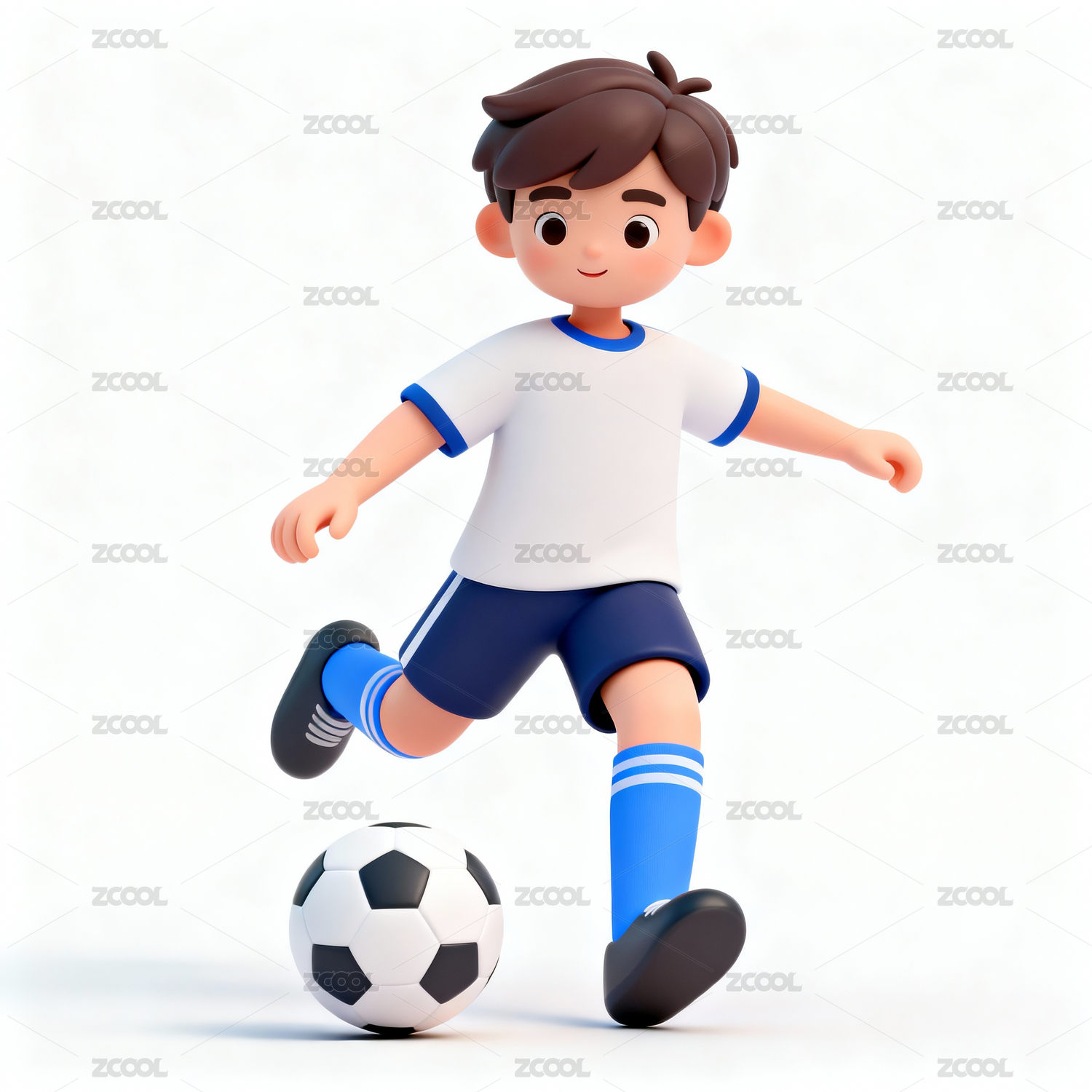 穿蓝色运动服的男孩在踢足球3D插画素材