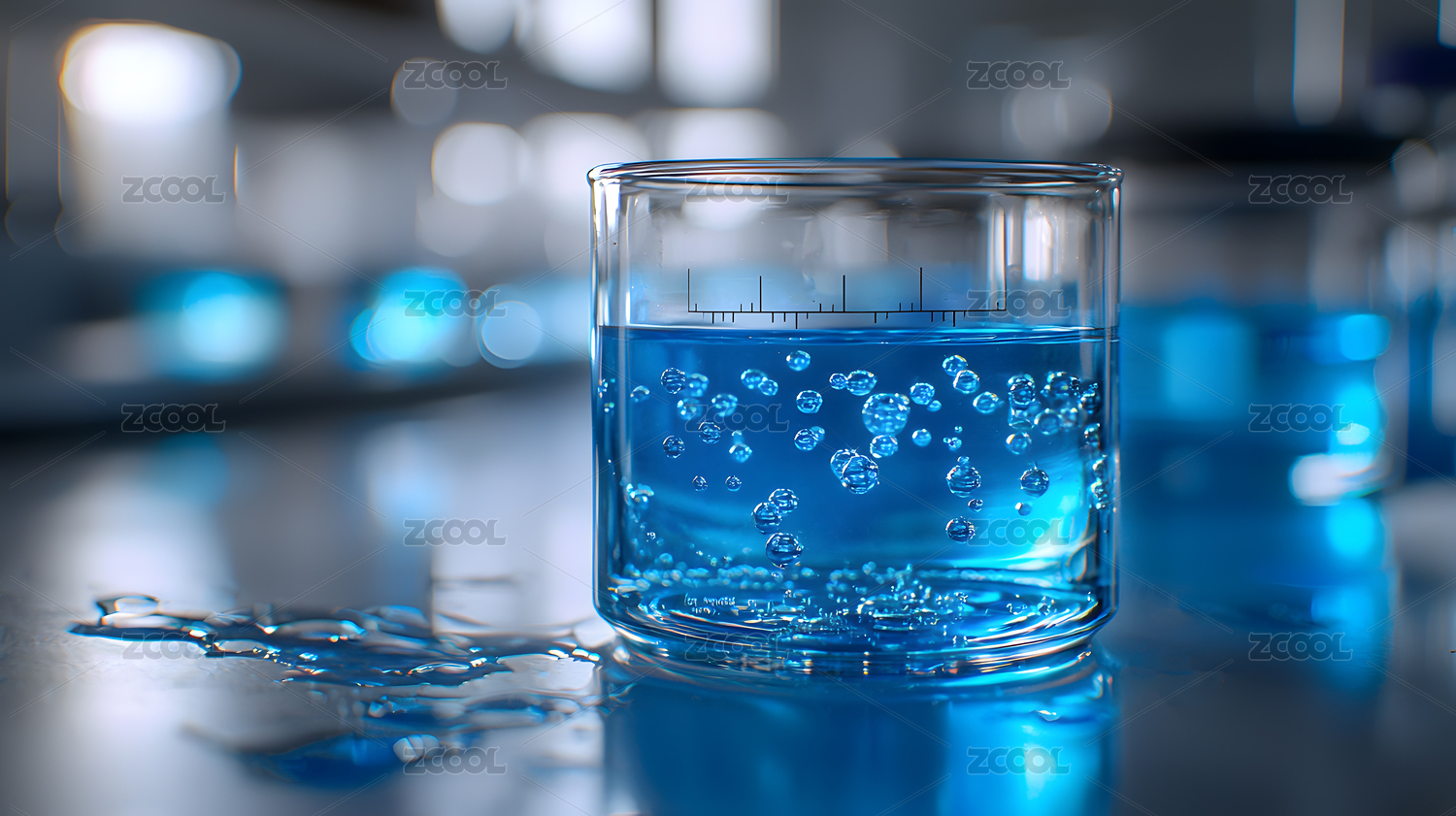 蓝色液体滴入烧杯产生气泡