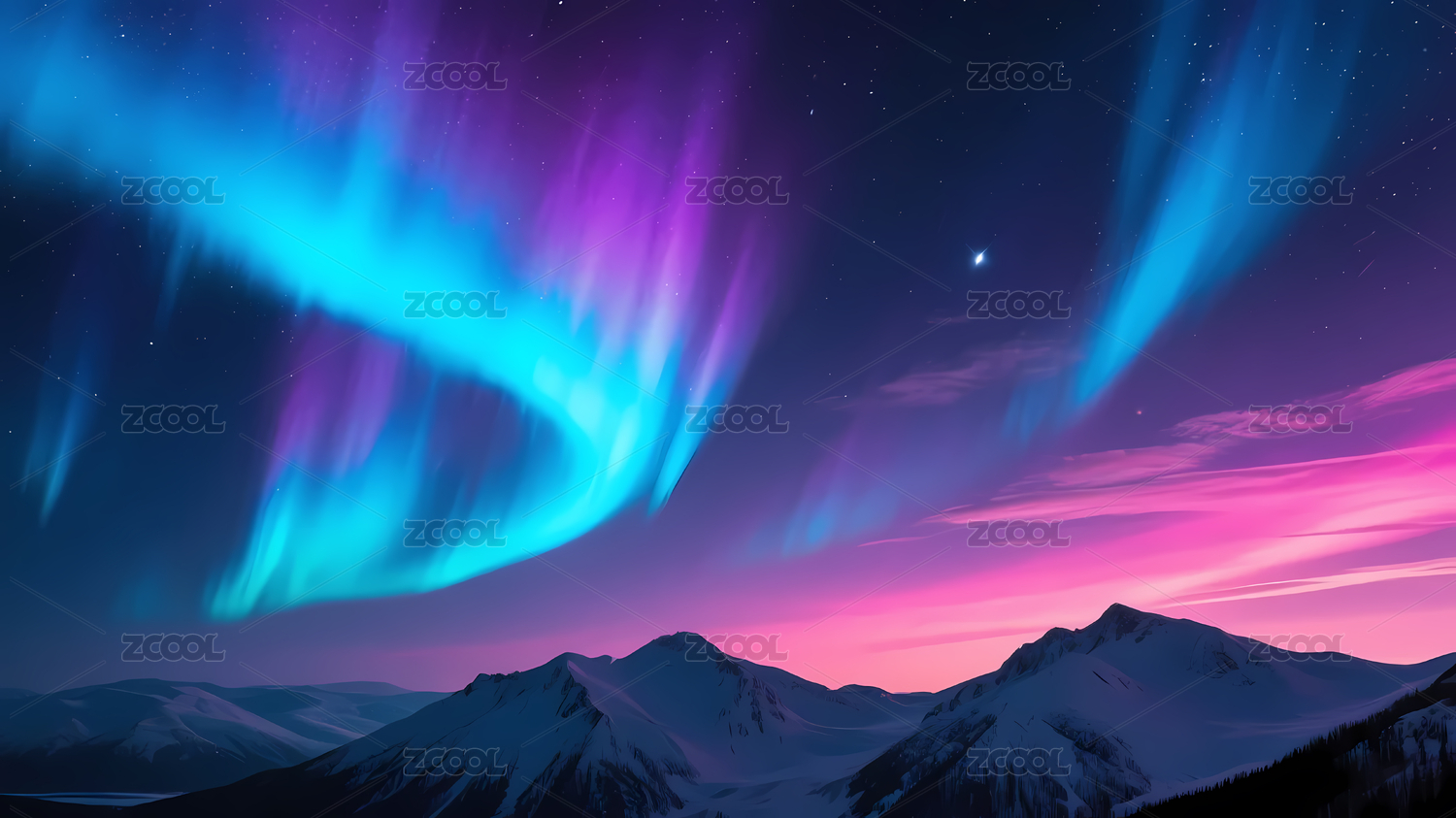 粉蓝北极光雪山夜空景色