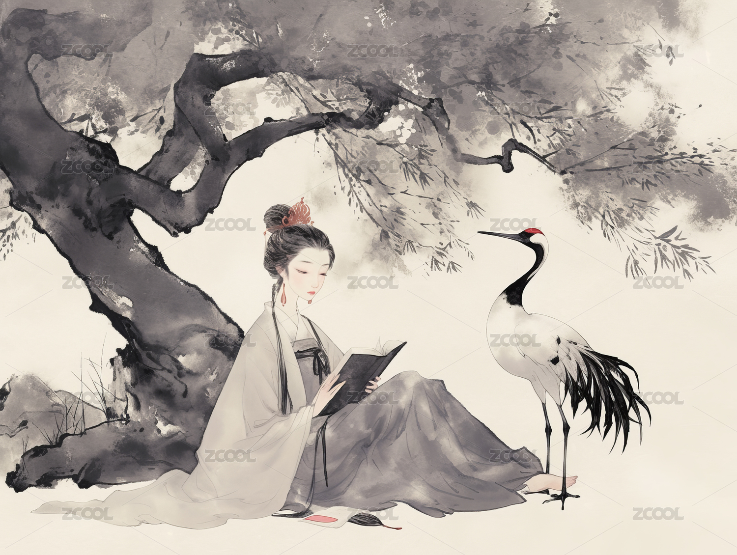 树下看书的女人仙鹤国风水墨画工笔画国画