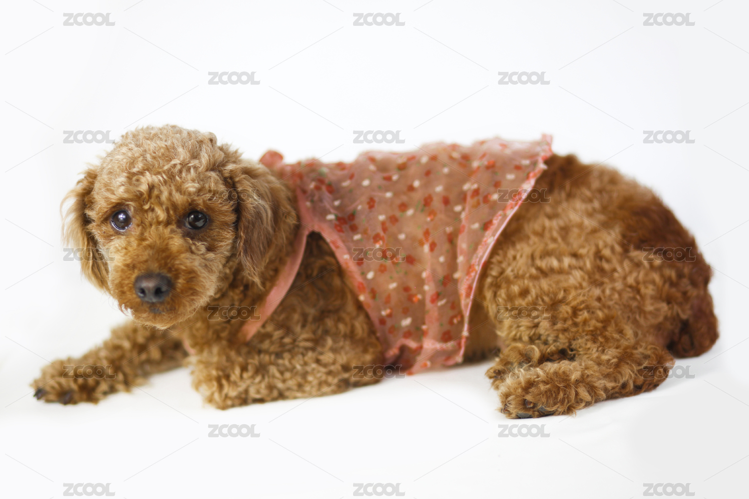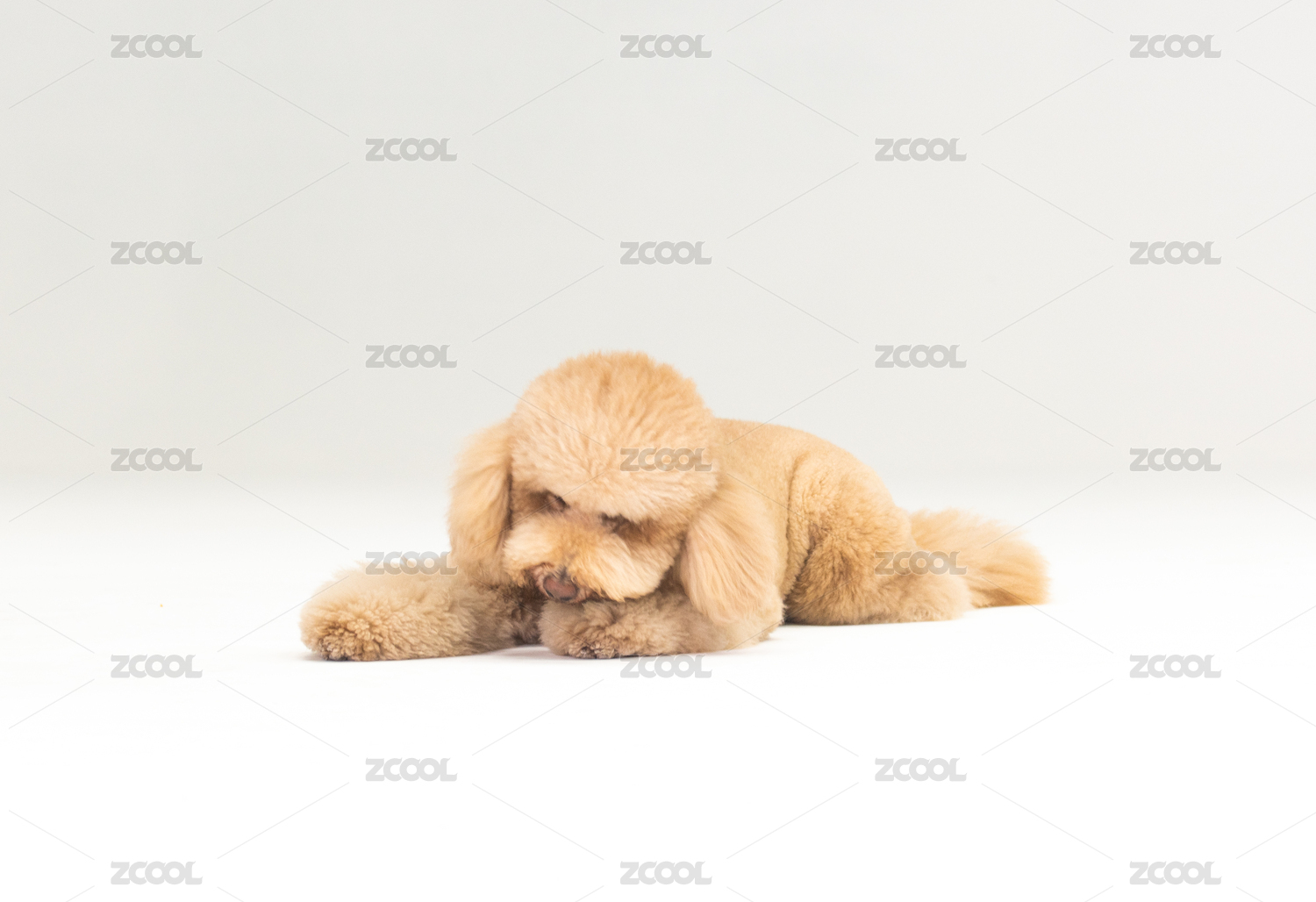 白色背景下趴着的可爱泰迪狗狗