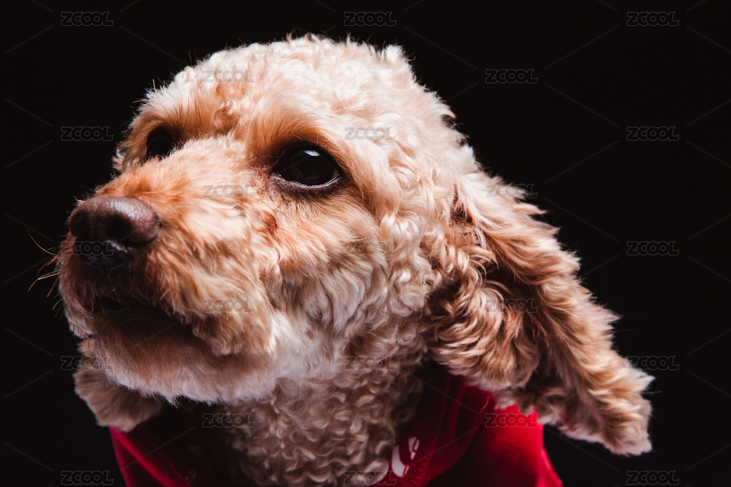 特写黑色背景分离身穿红色衣服的泰迪犬