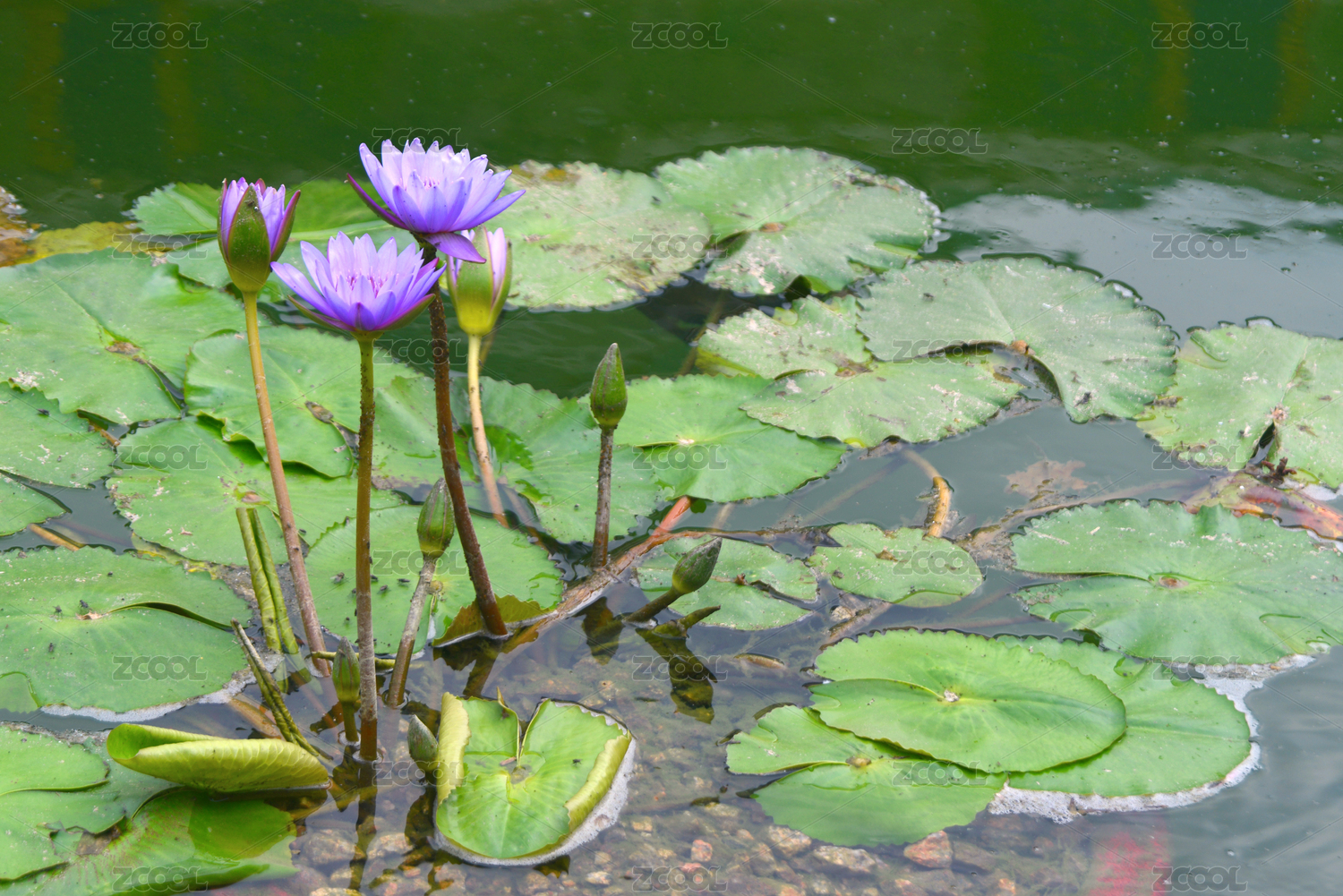 池塘里即将盛开的紫色睡莲