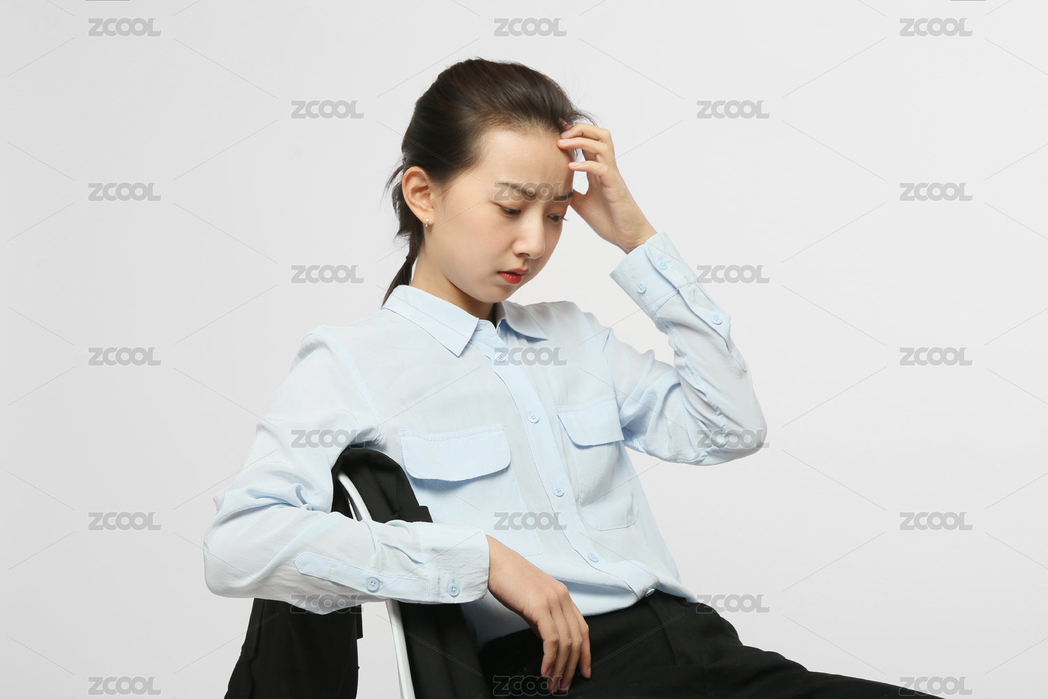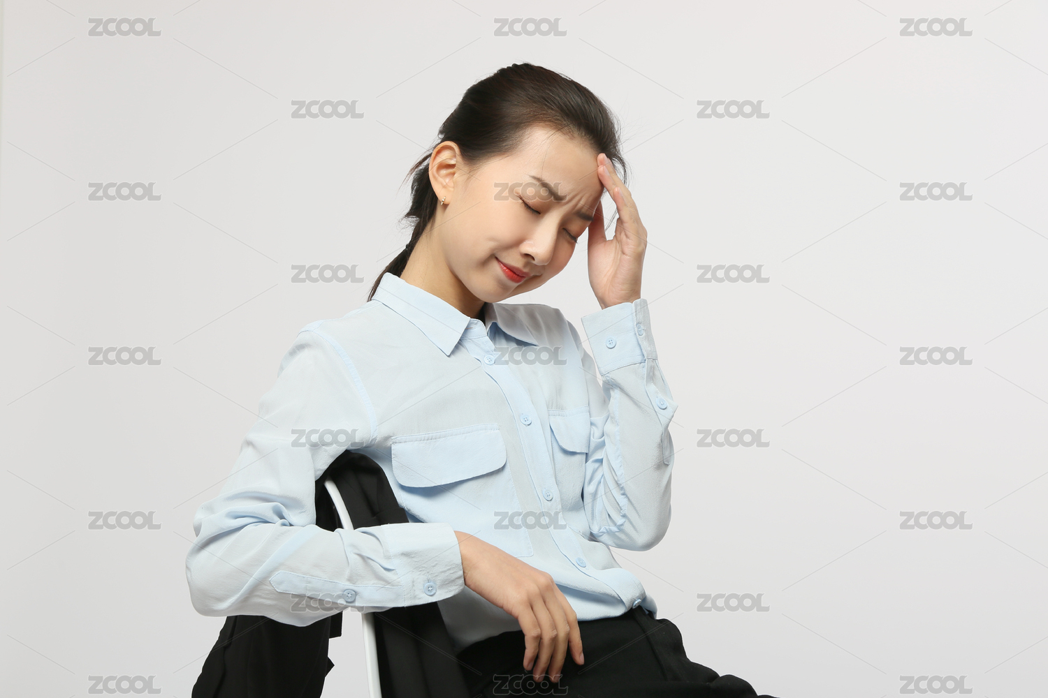 坐在椅子上的女白领皱着眉挤按睛明穴