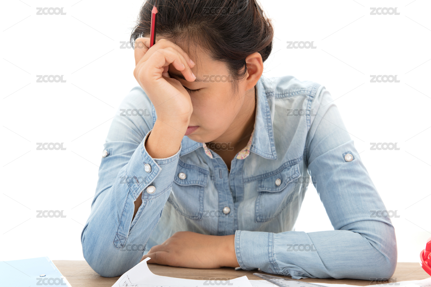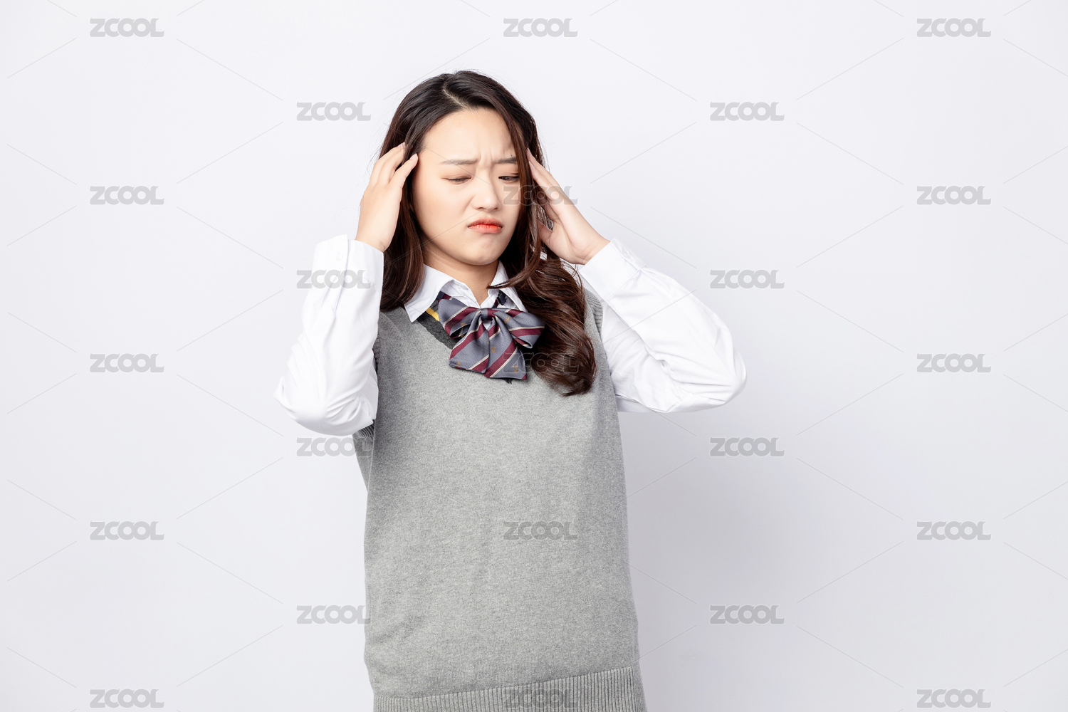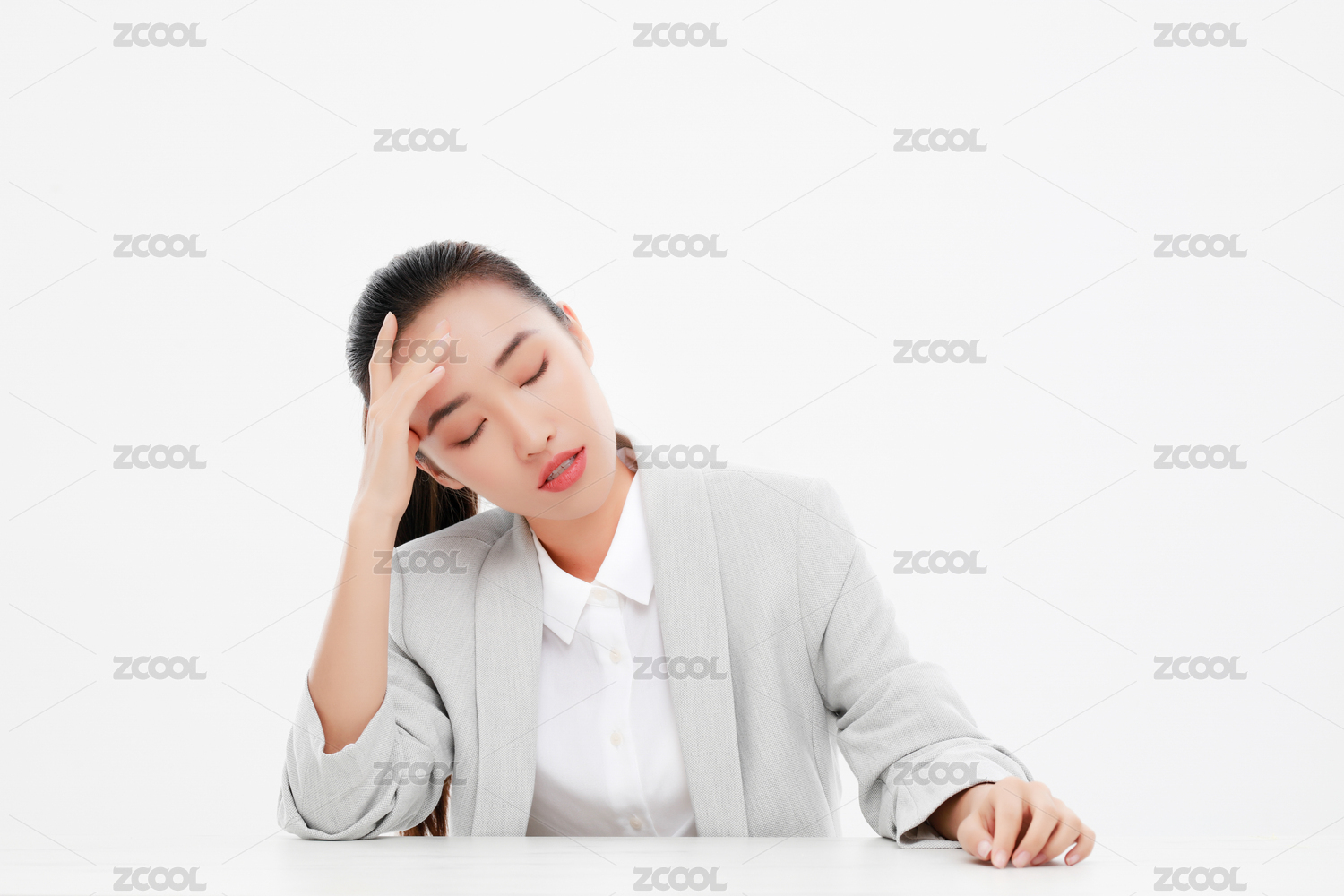 白色背景下一个中国女员工穿着正装西服抱着自己的头感到很烦恼头痛头疼压力大