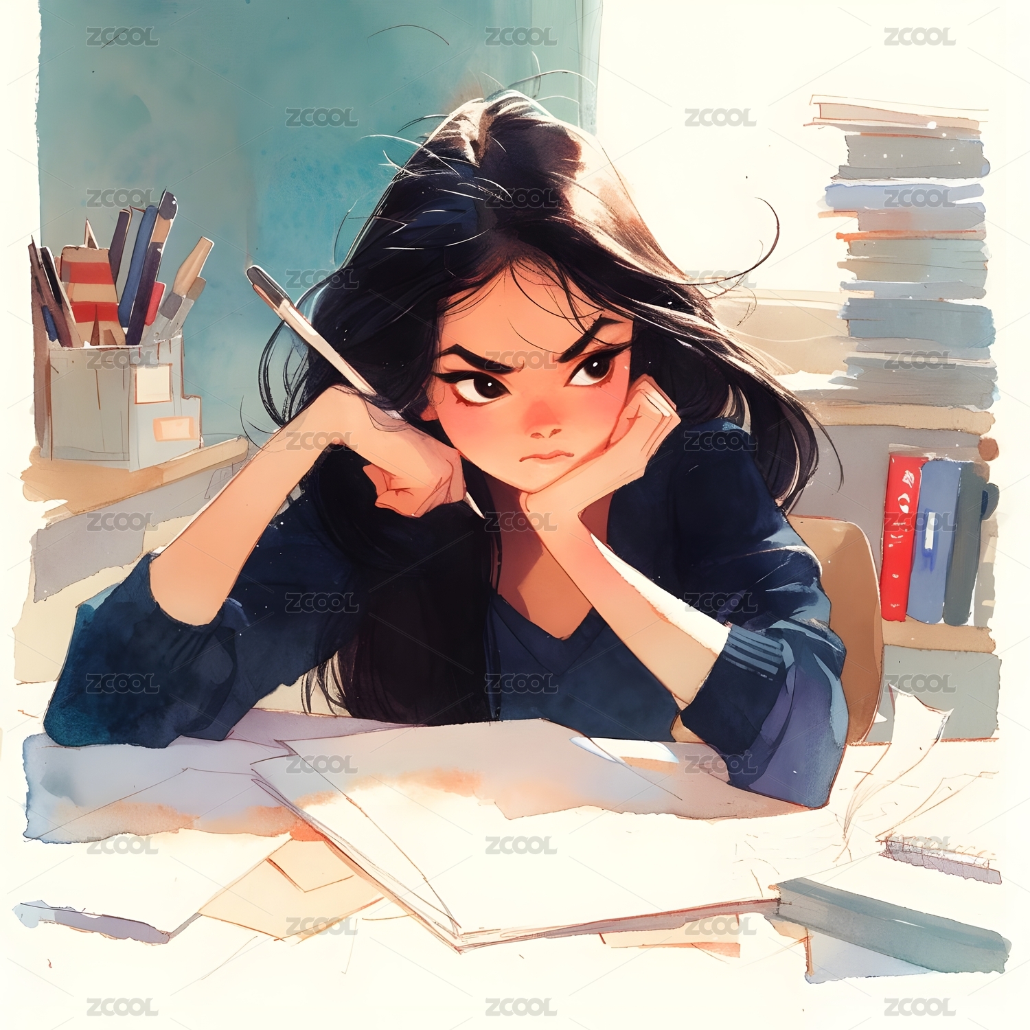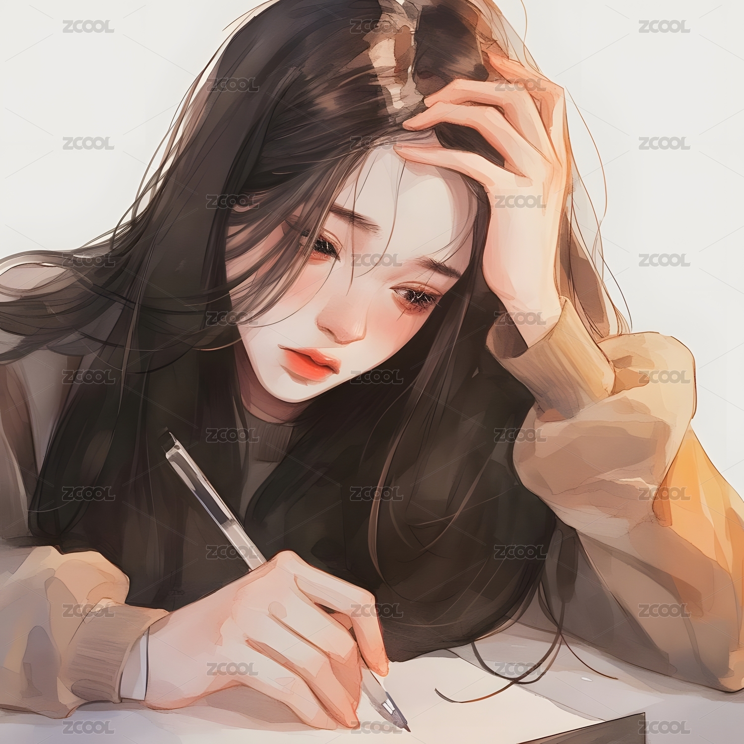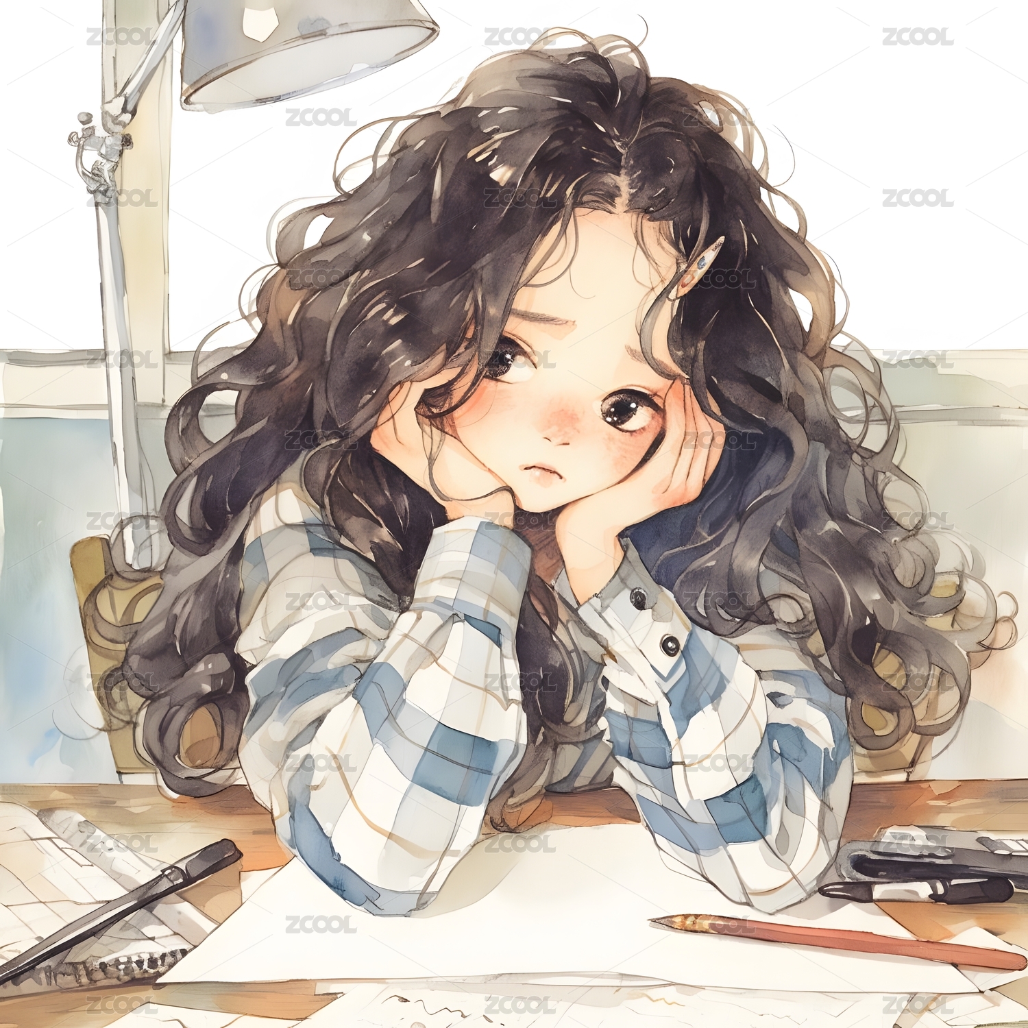 女,长发,头像,学习,办公,怨念,情绪,插画