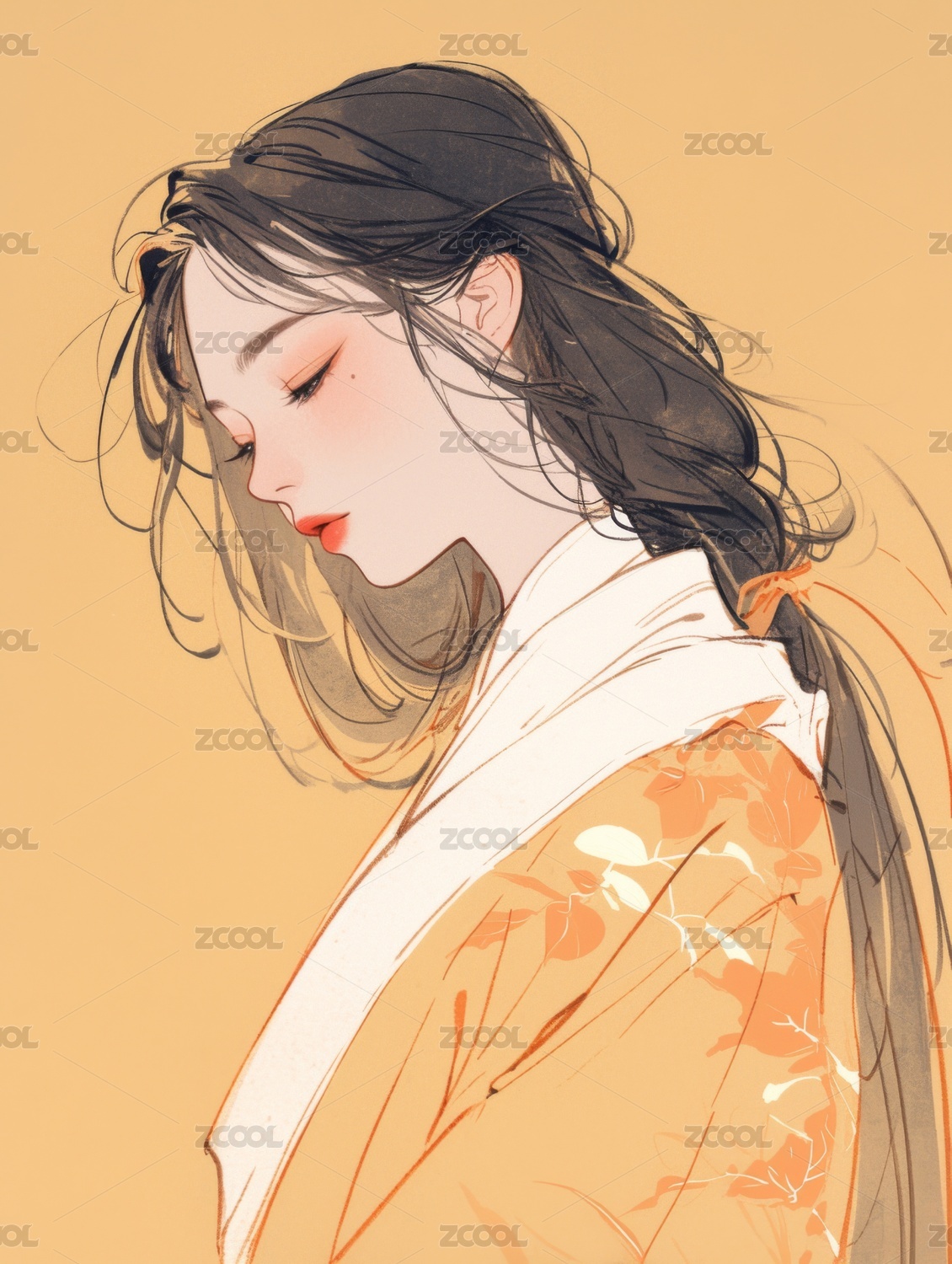 夏天黑头发黄皮肤东方女性头像扁平插画绘画