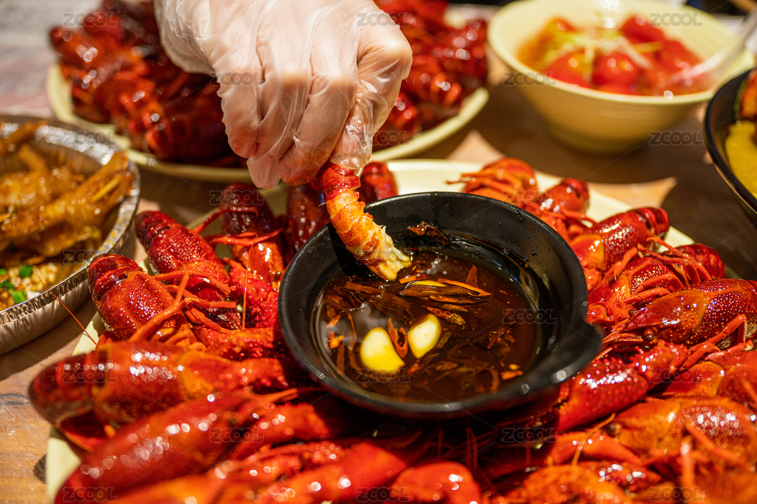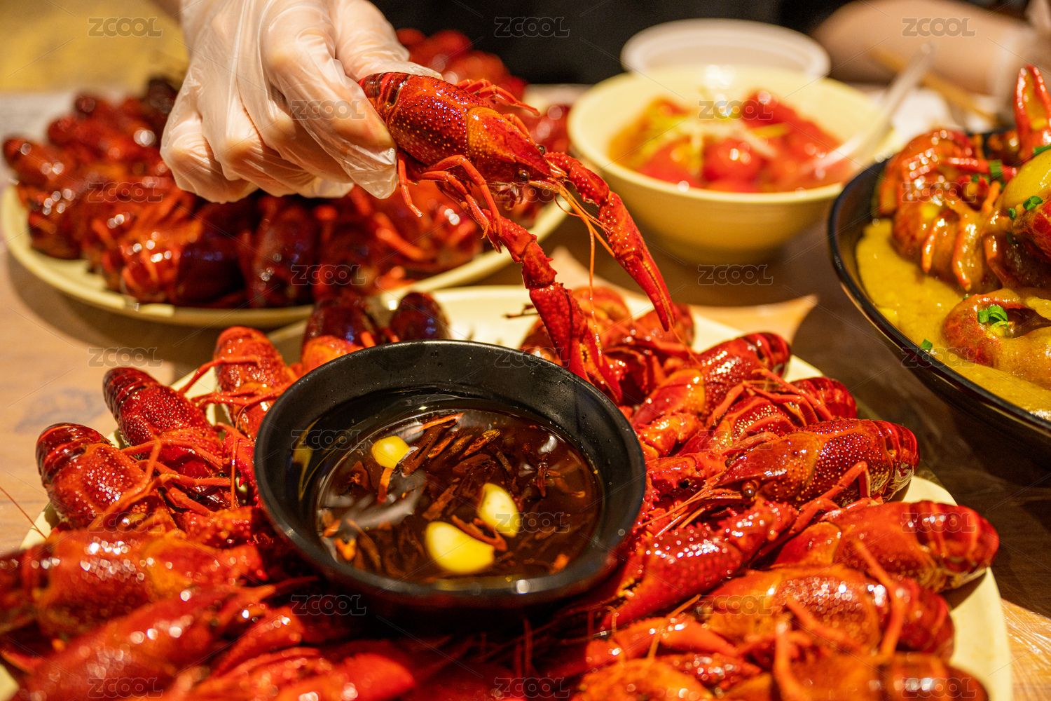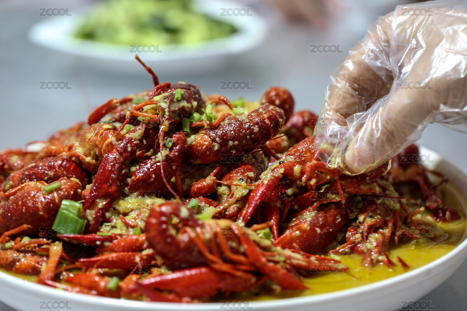 餐馆内一个人用手剥开蒸熟的小龙虾