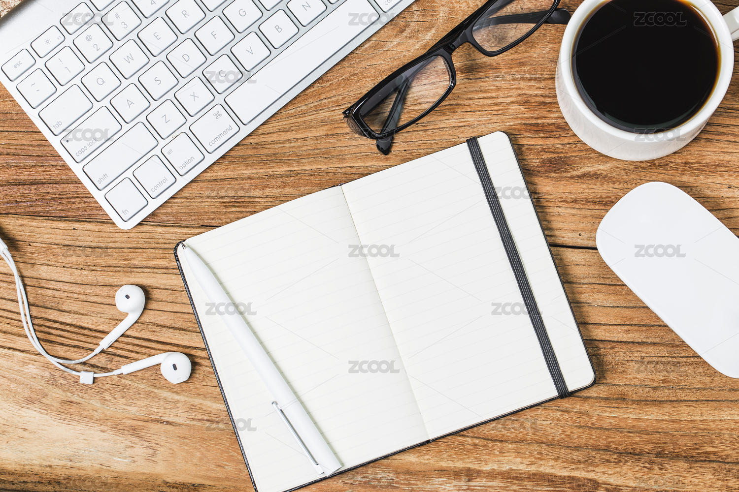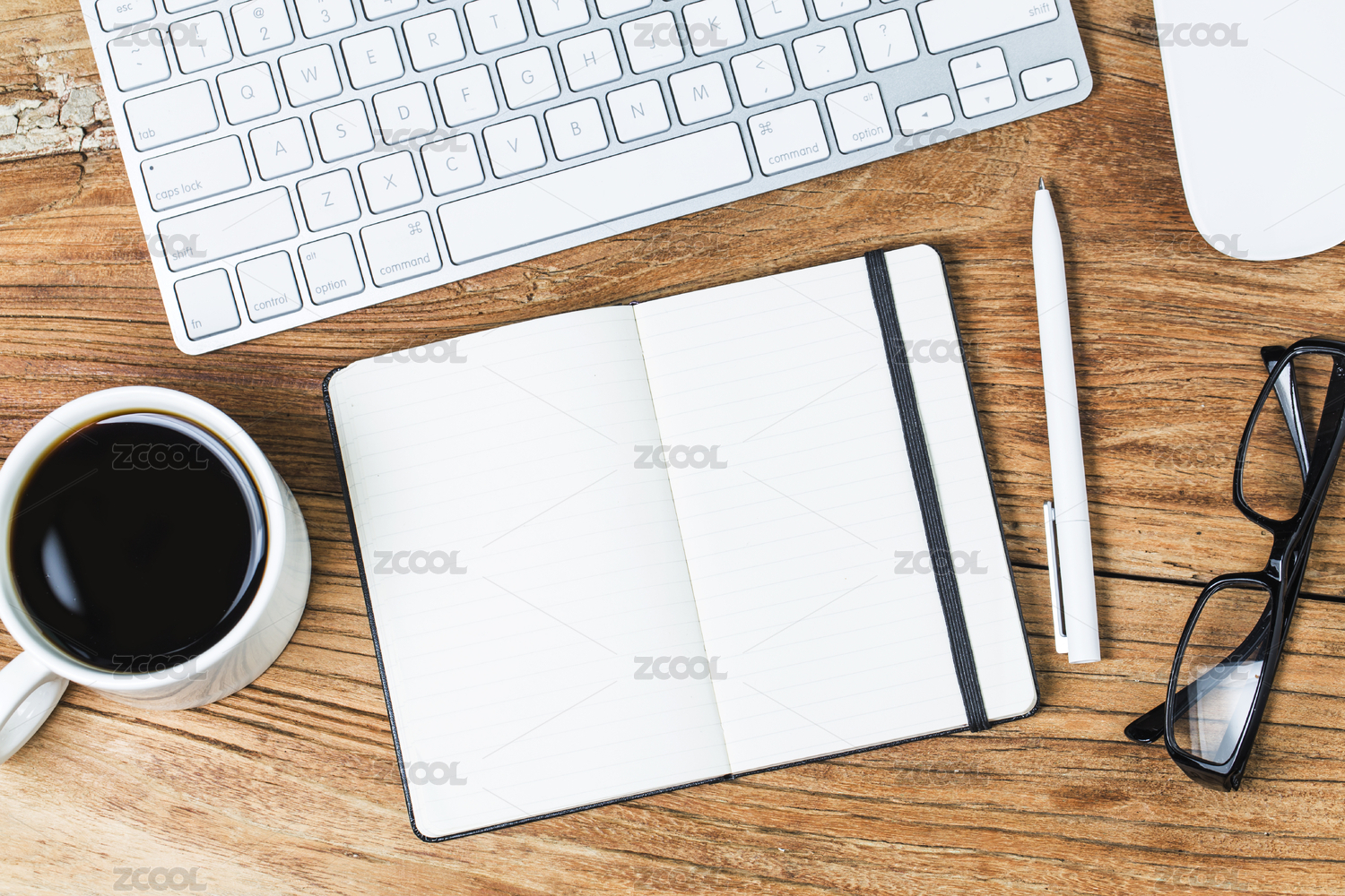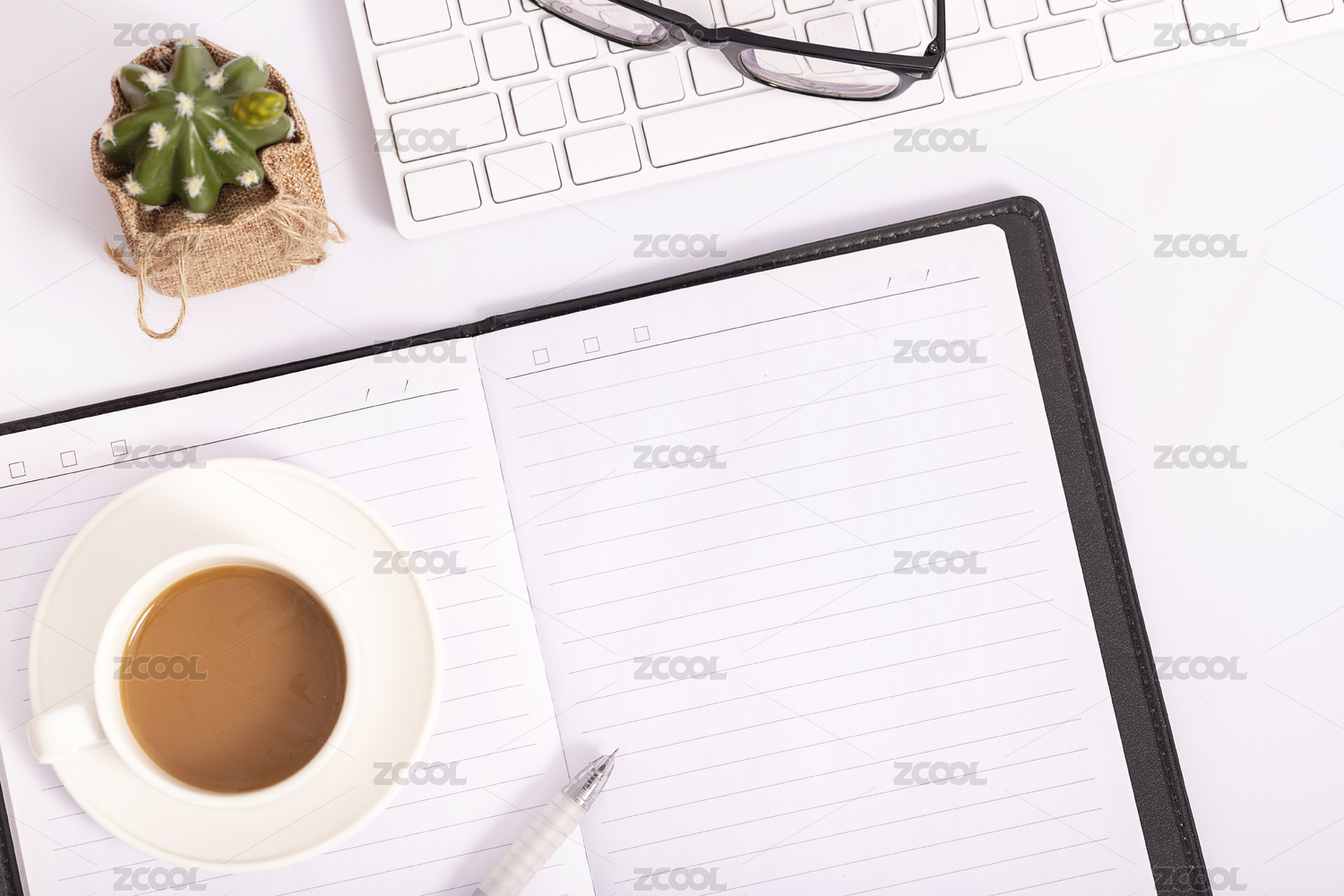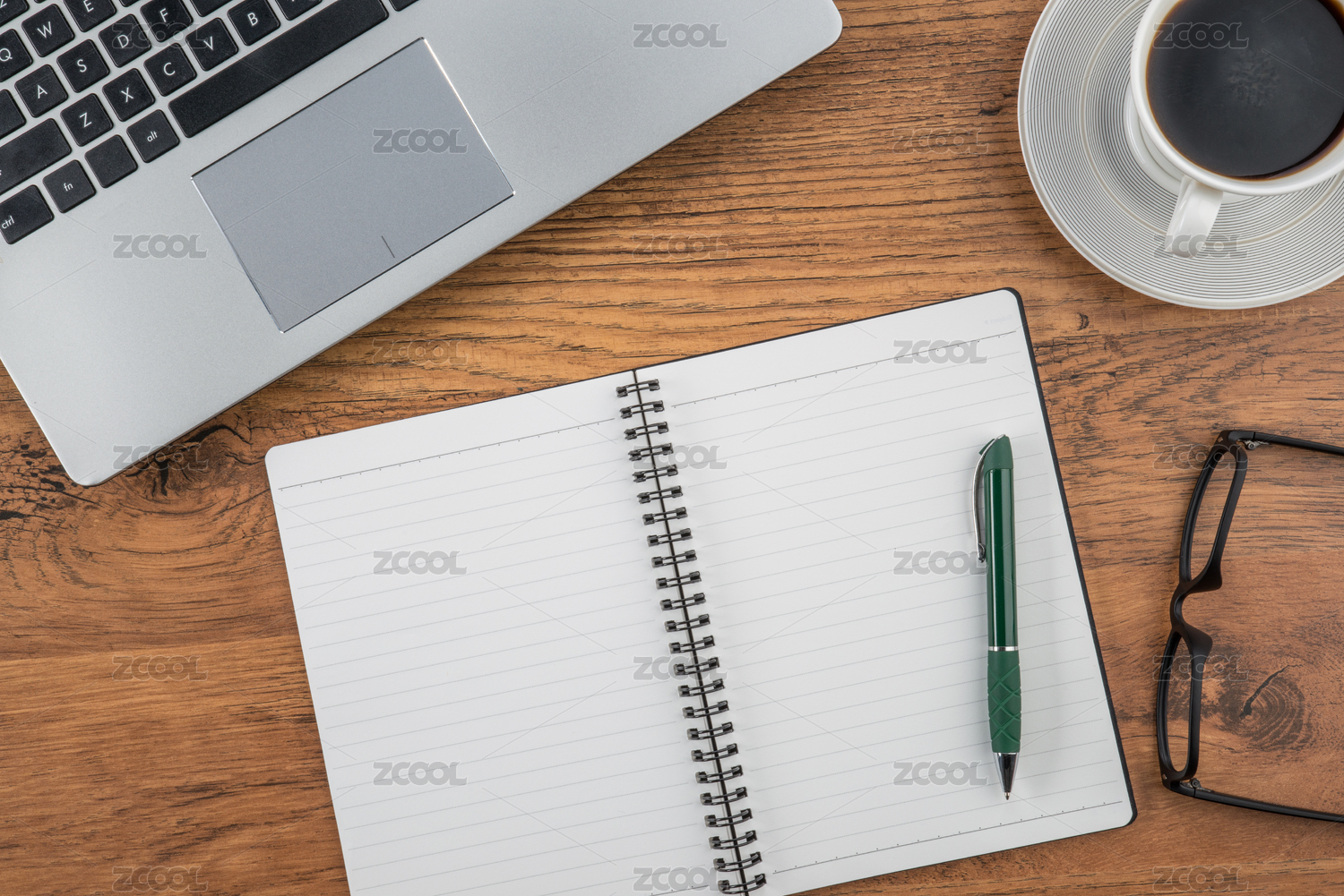 笔记本电脑,笔记本和笔与办公桌咖啡杯