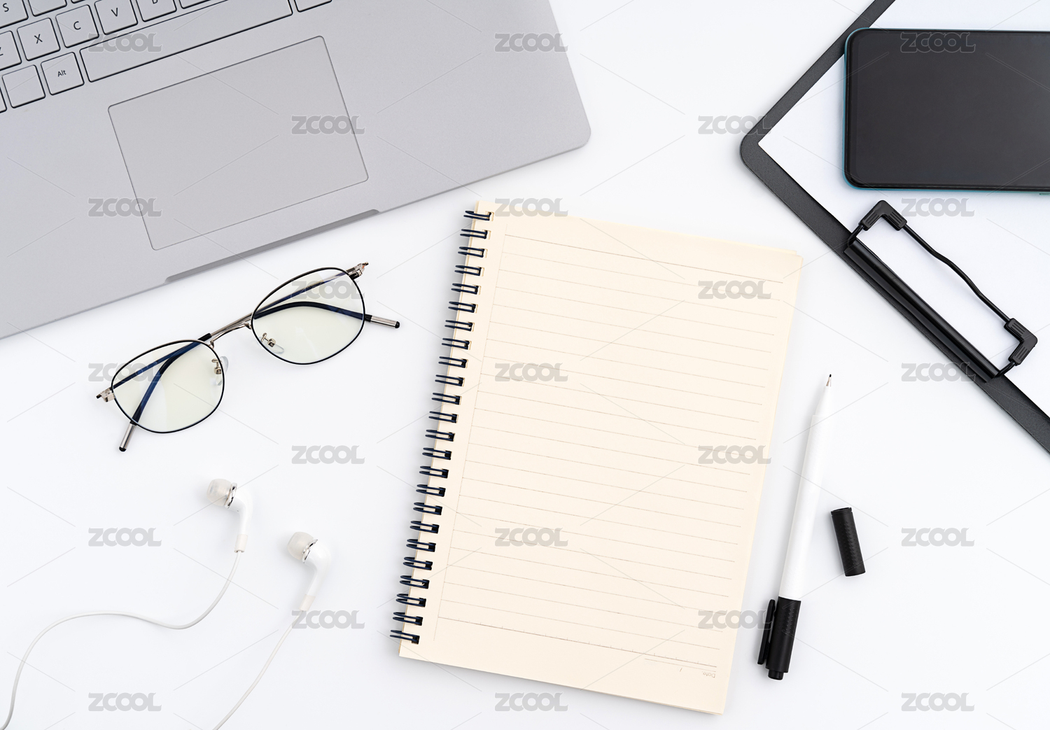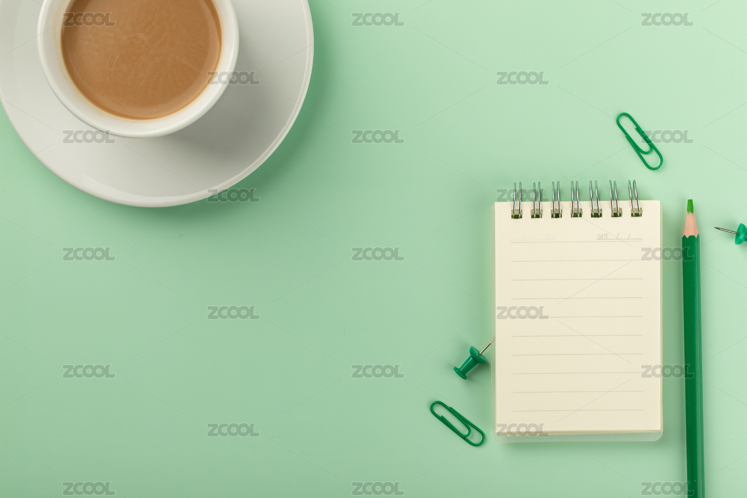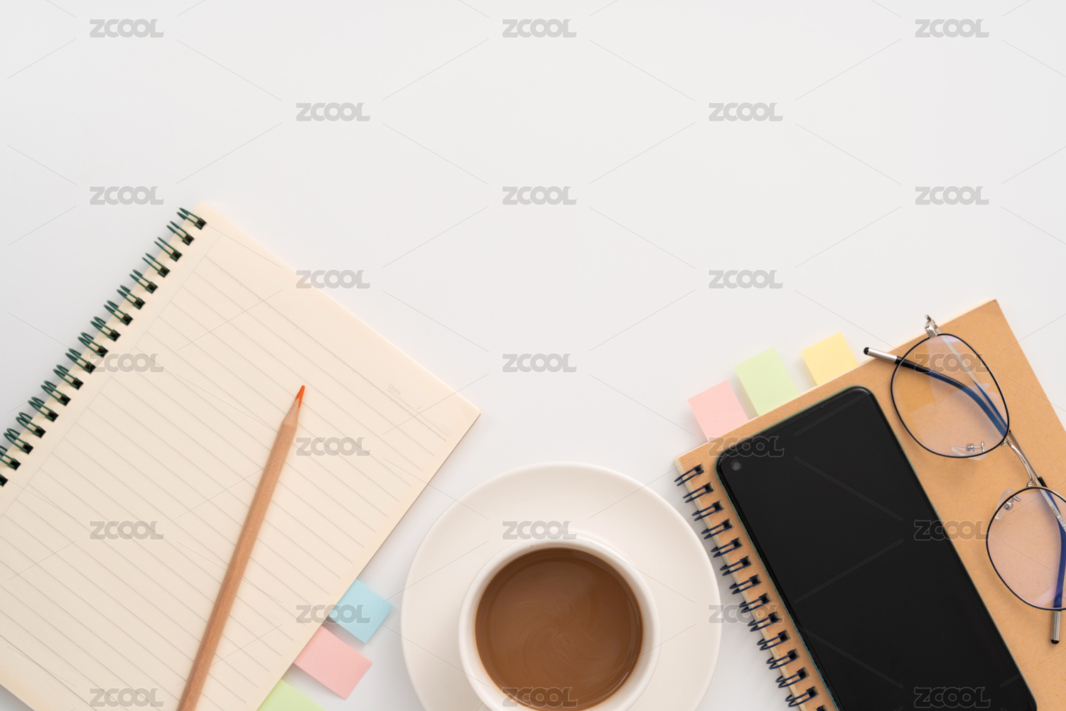 笔记本电脑,笔记本和笔与办公桌咖啡杯