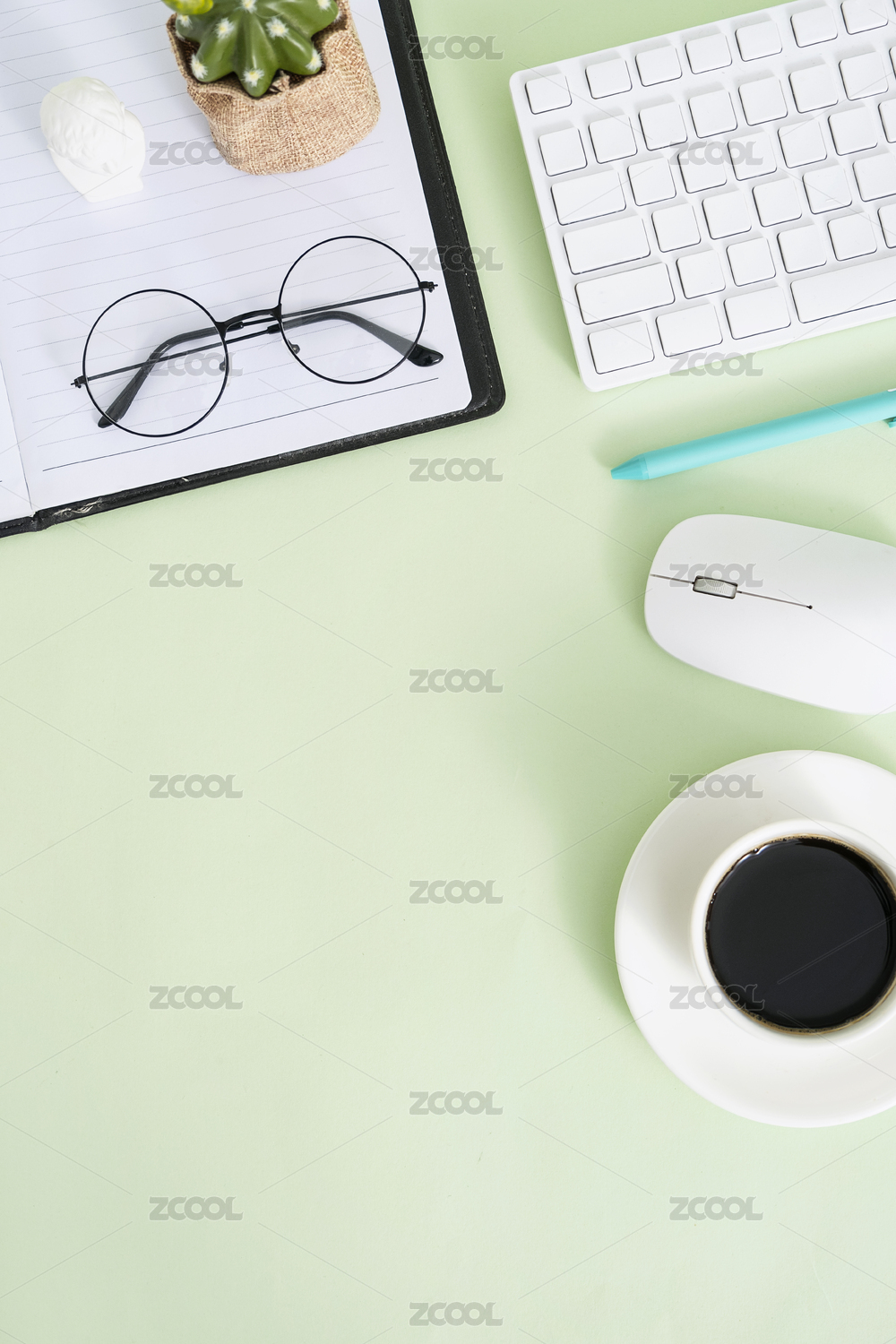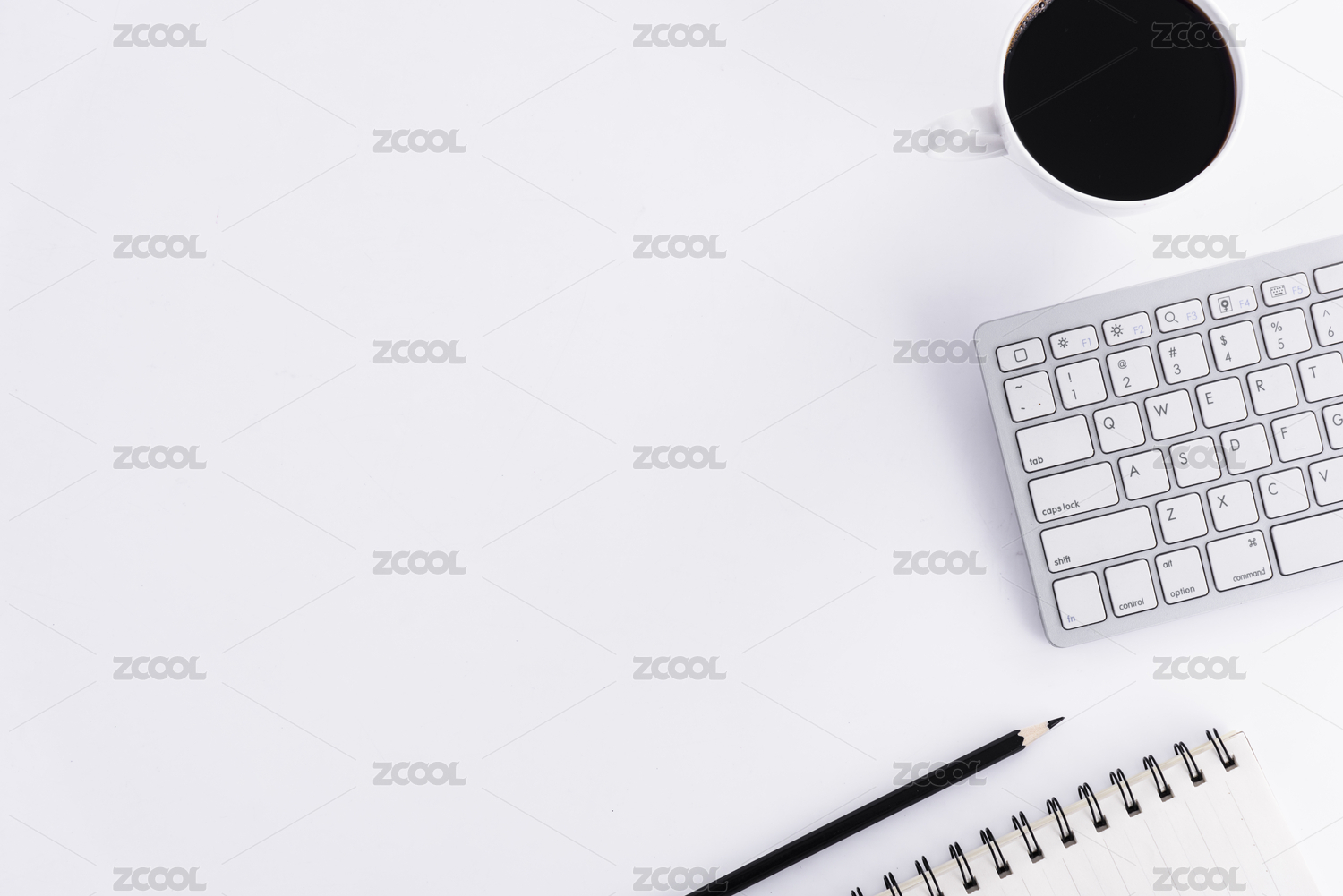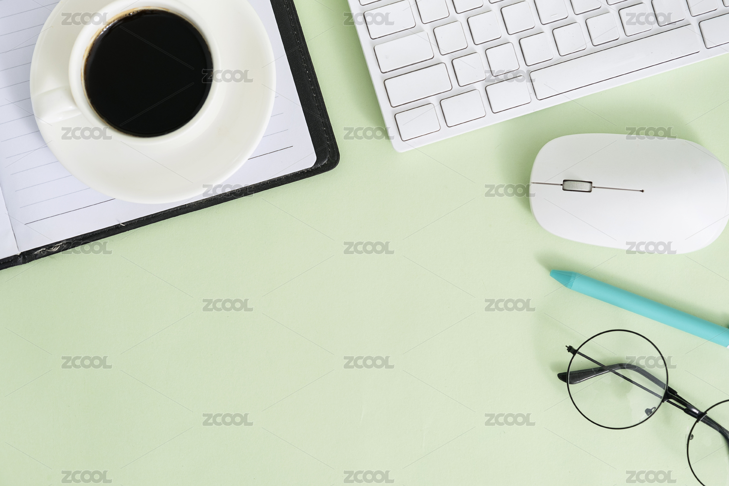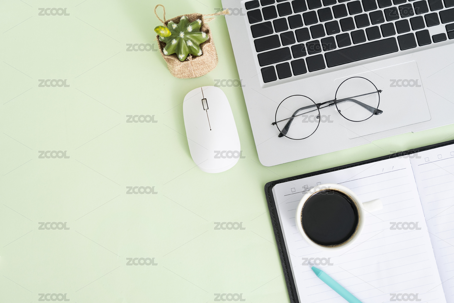 笔记本电脑,笔记本和笔与办公桌咖啡杯