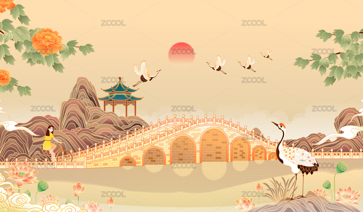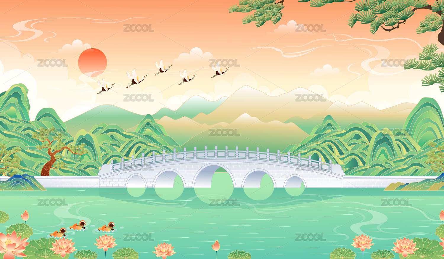 国潮山水西湖矢量插画
