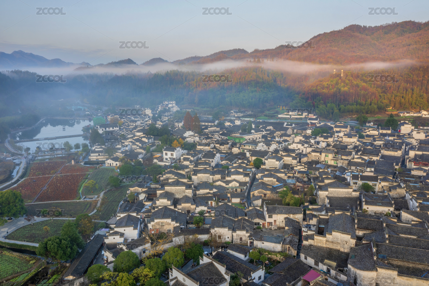 航拍江西婺源石城徽派建筑秋色枫叶村庄日出