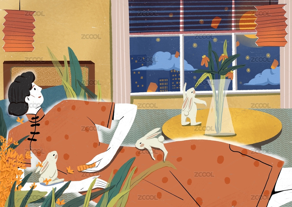 兔子,中秋,桂花,云朵,植物,赏月,旗袍,女孩,中秋节,插画