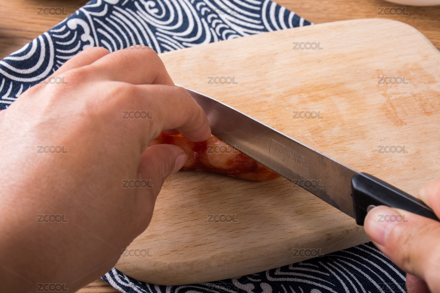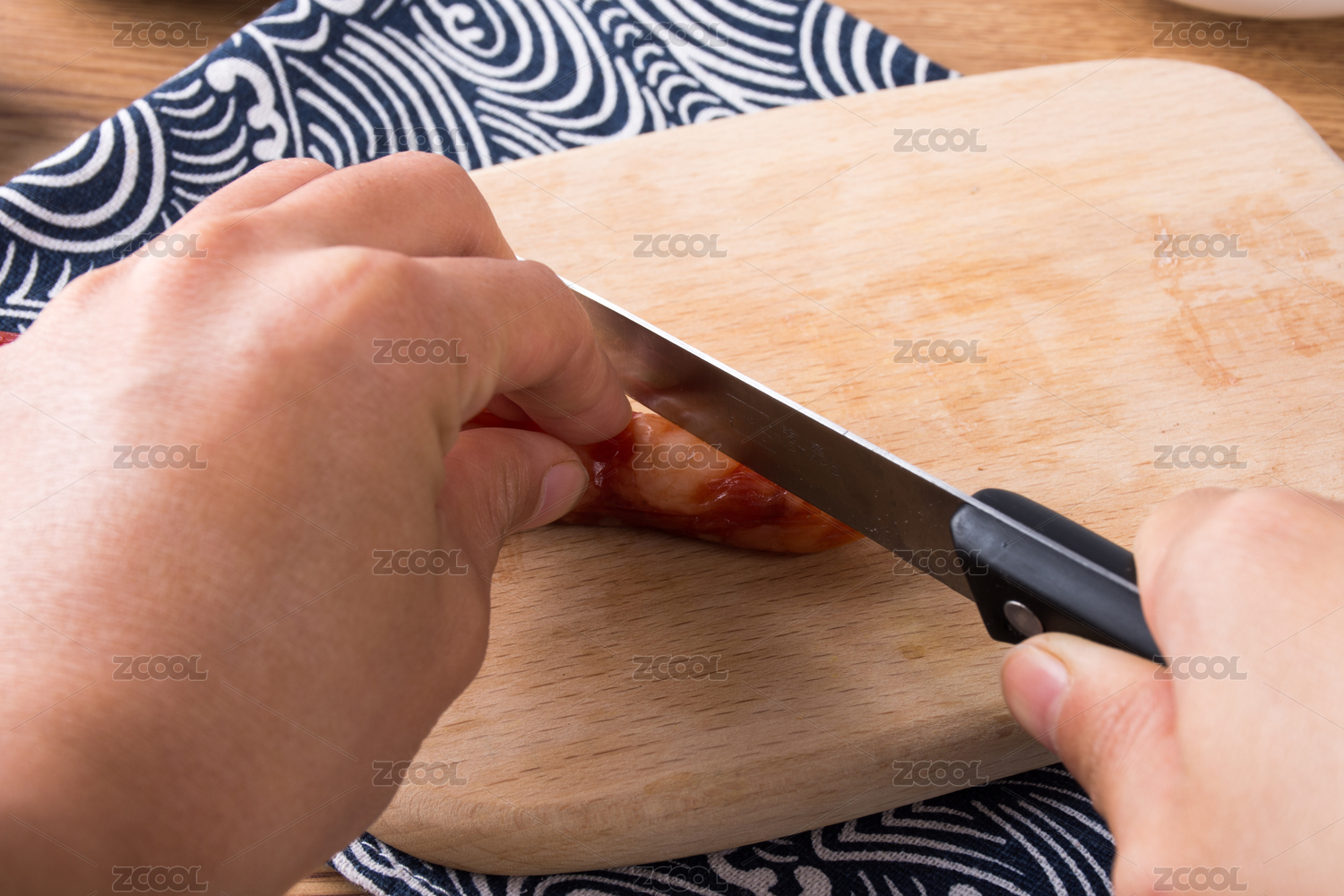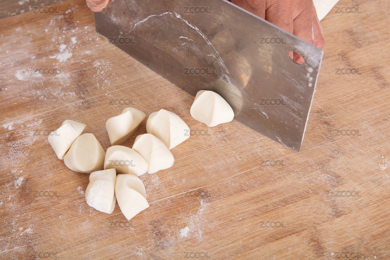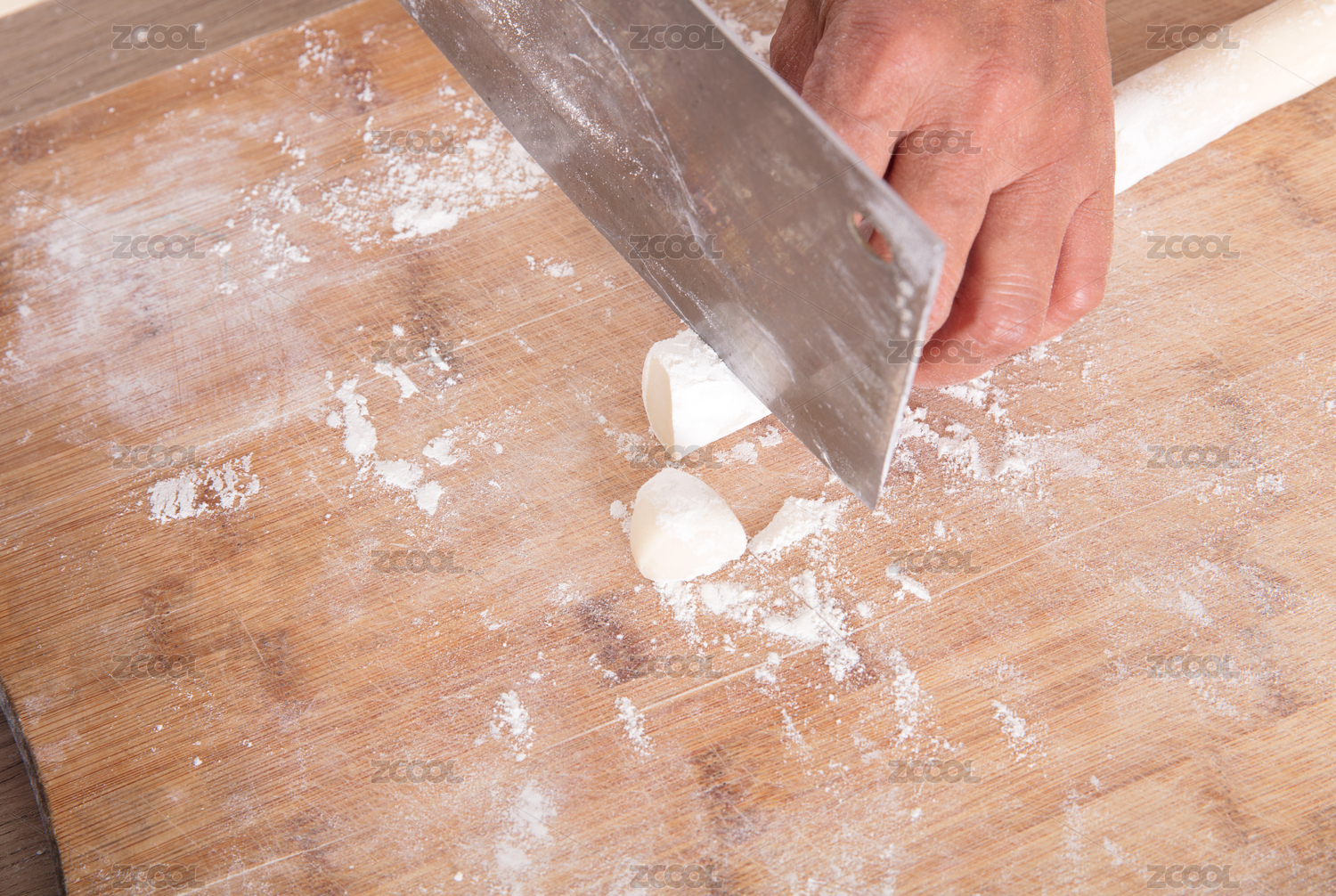手拿菜刀把长条状的白面在砧板上切成小面团