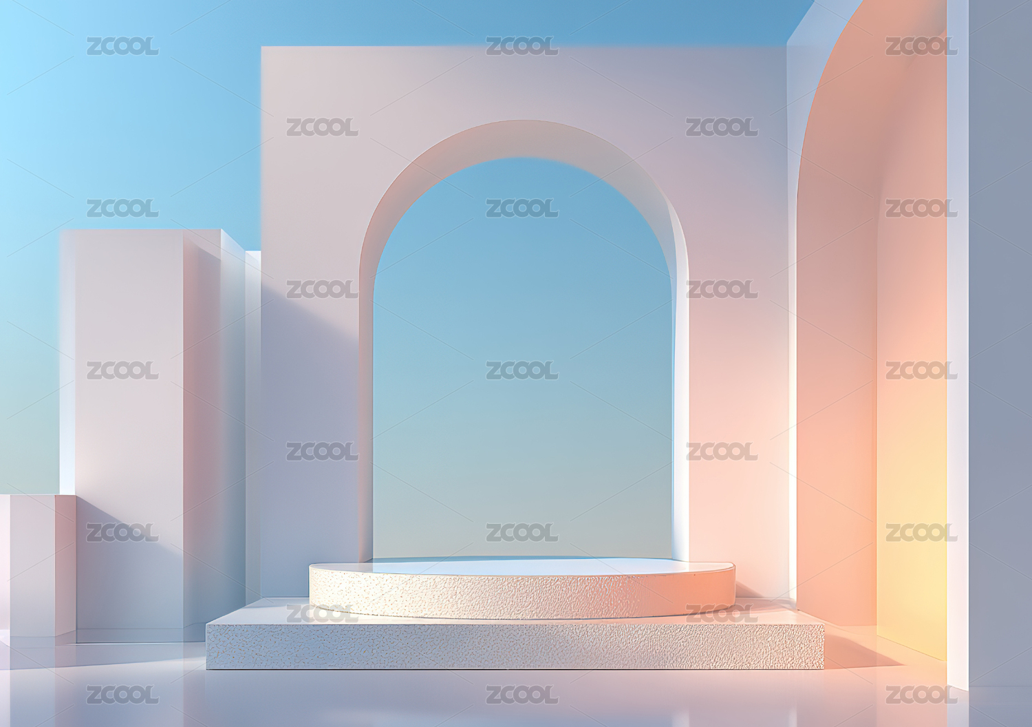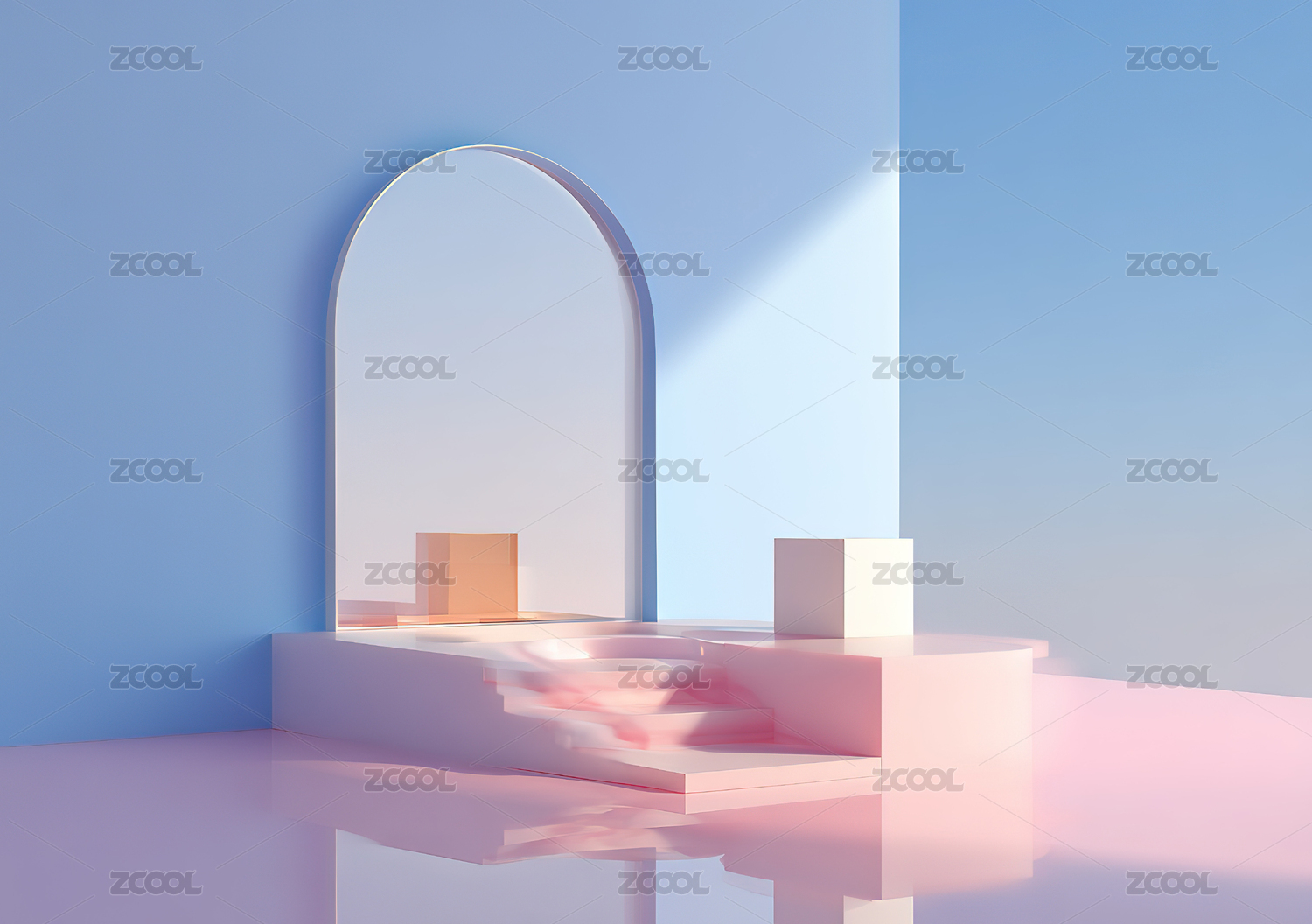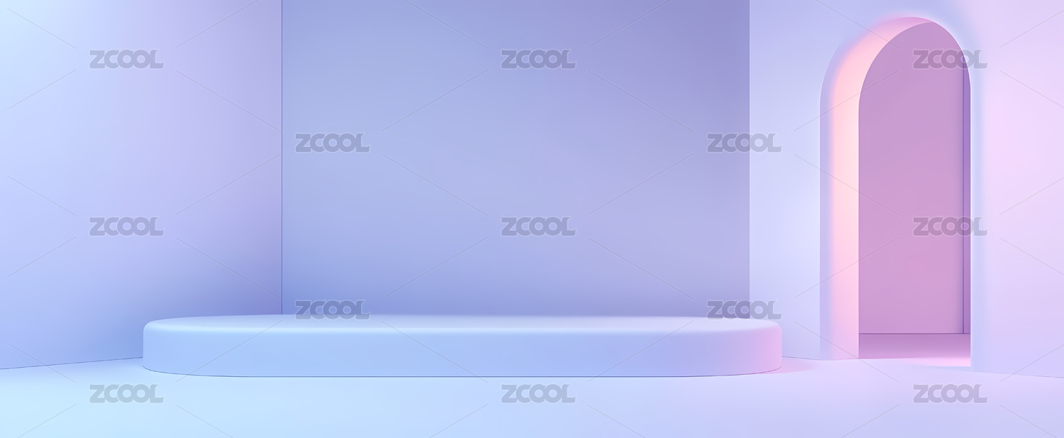 3D风格,柔色,梦幻,紫色调,空间,展示台,大理石,拱门,冰块,玻璃