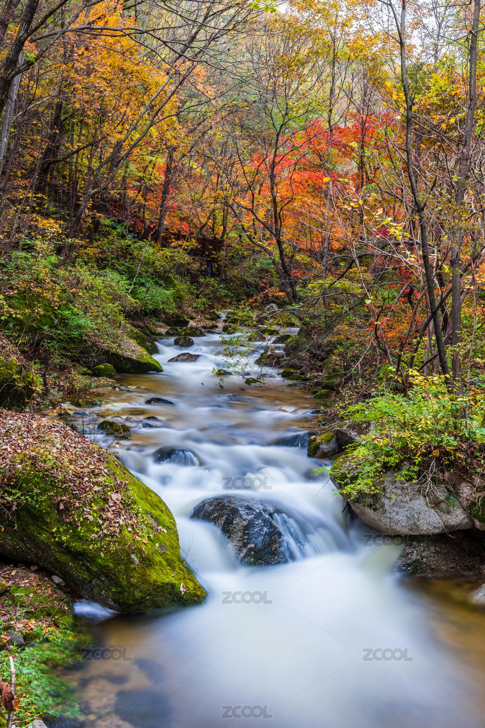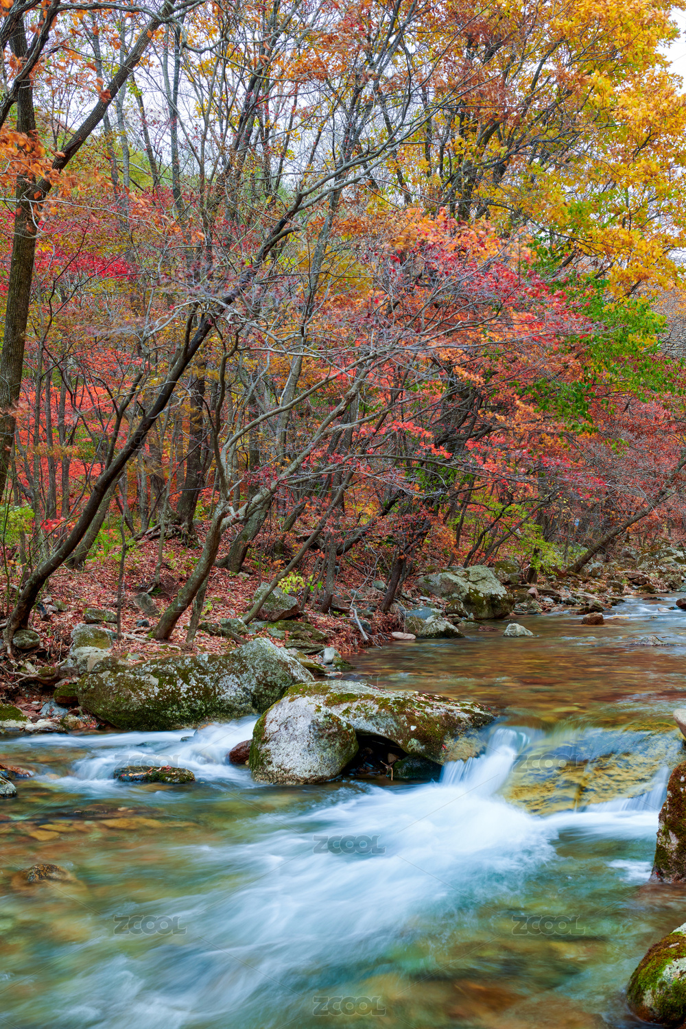 红叶岩石流水瀑布秋季风光