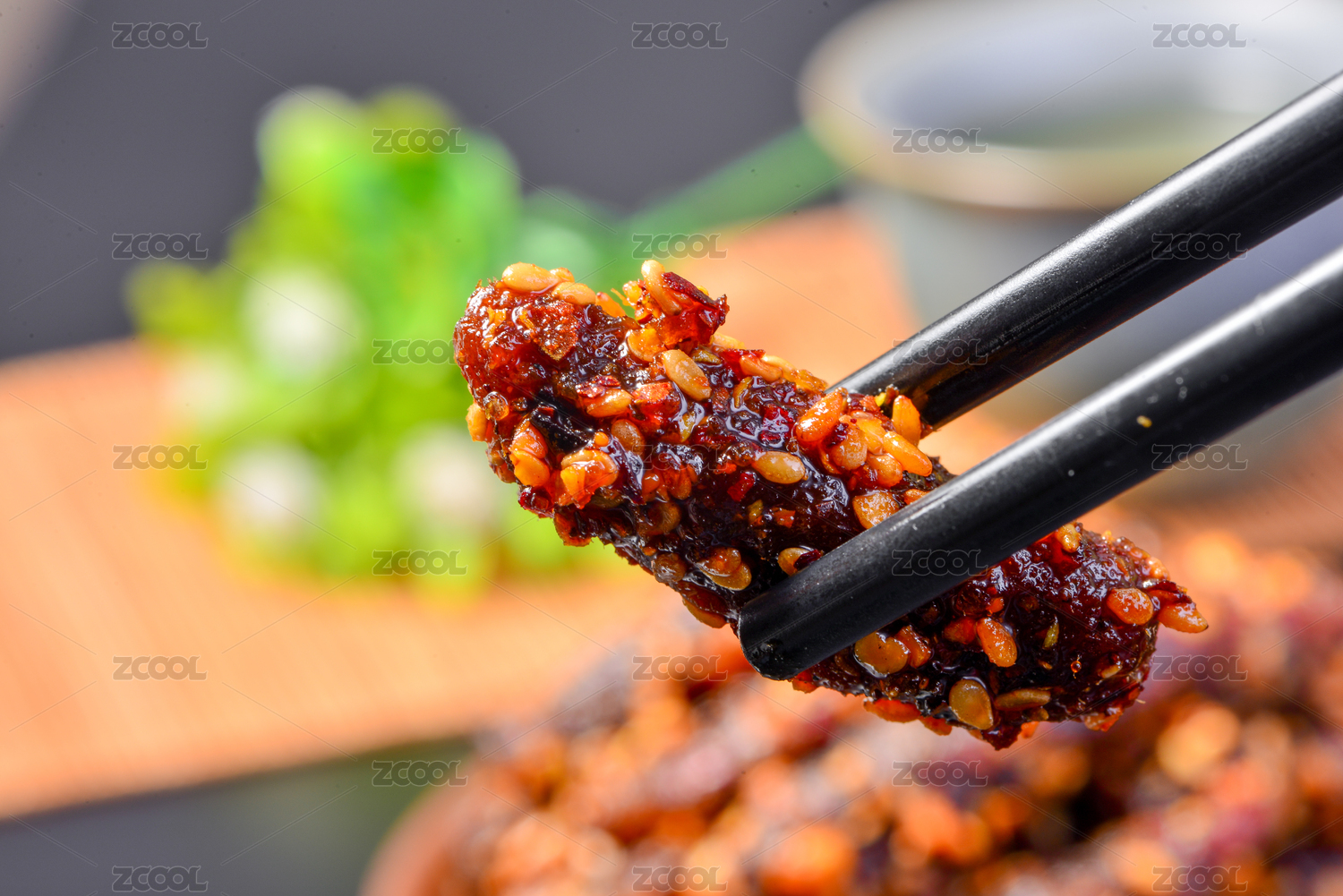 黑色背景上筷子夹起的麻辣花蛤肉