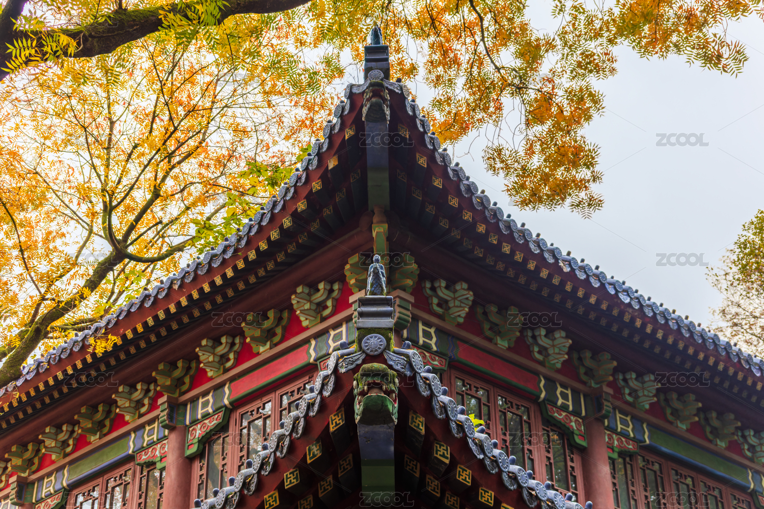 秋日南京钟山美龄宫屋檐与树叶