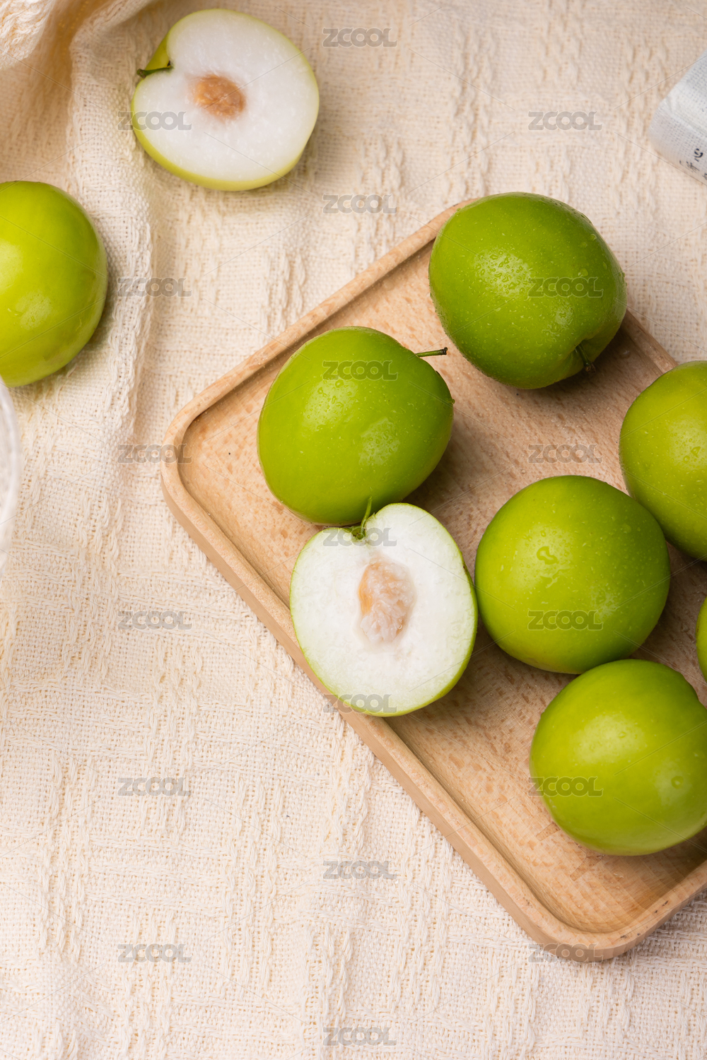 木底上放着一盘牛奶枣和牛奶枣切面