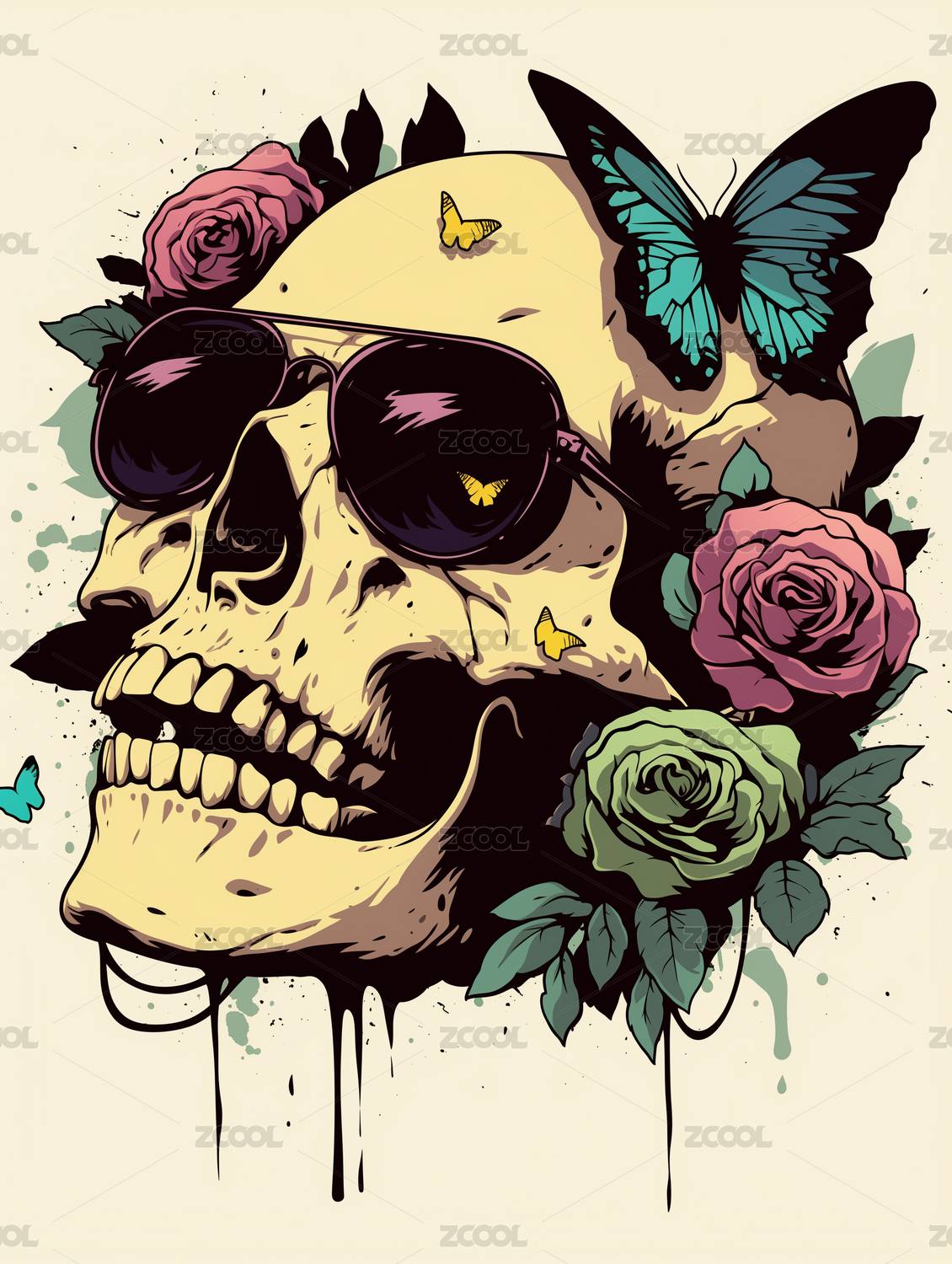 骷髅头玫瑰花蝴蝶暗黑风潮流插画