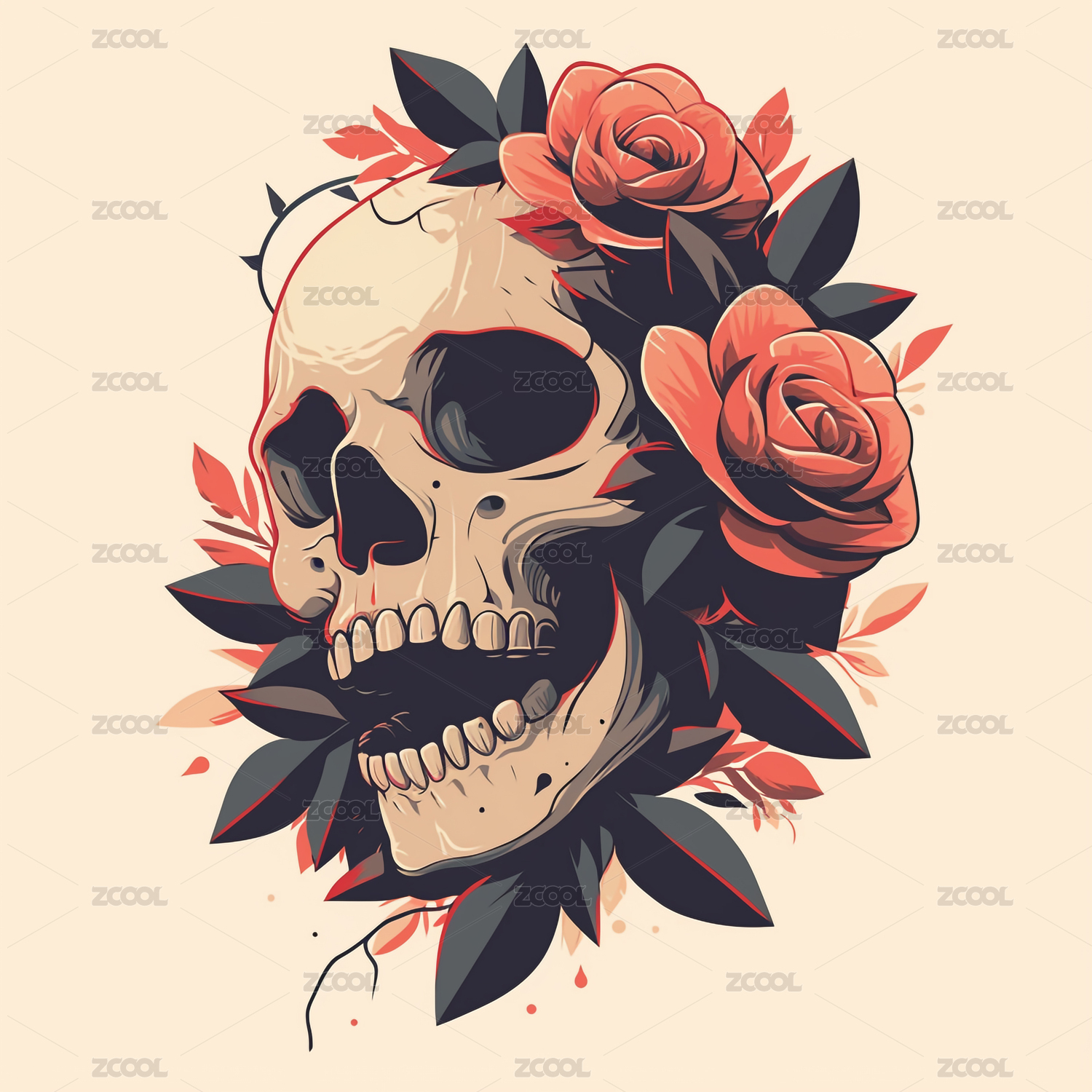 复古美式环绕玫瑰花的骷髅头骨装饰插画