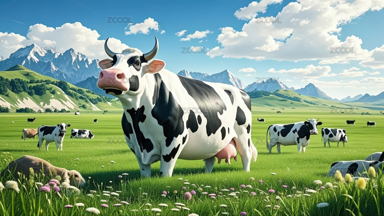 奶牛, 田园, 牧场, 草地, 绿色, 蓝天, 白云, 风景, 插画, 卡通