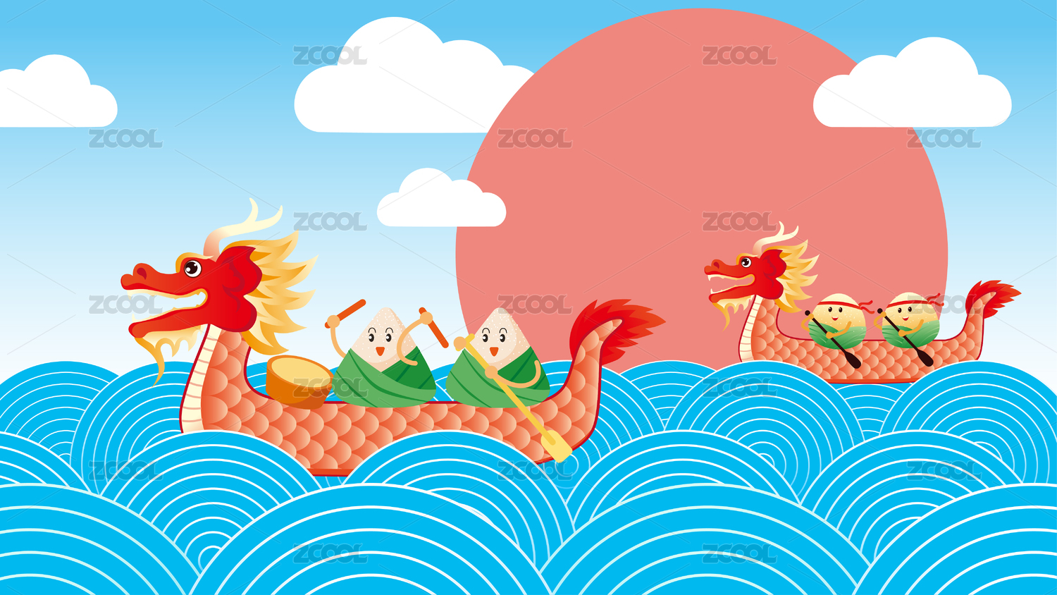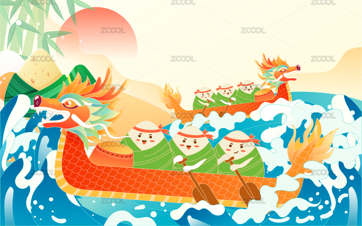 五月初五端午节快乐卡通粽子赛龙舟国潮插画