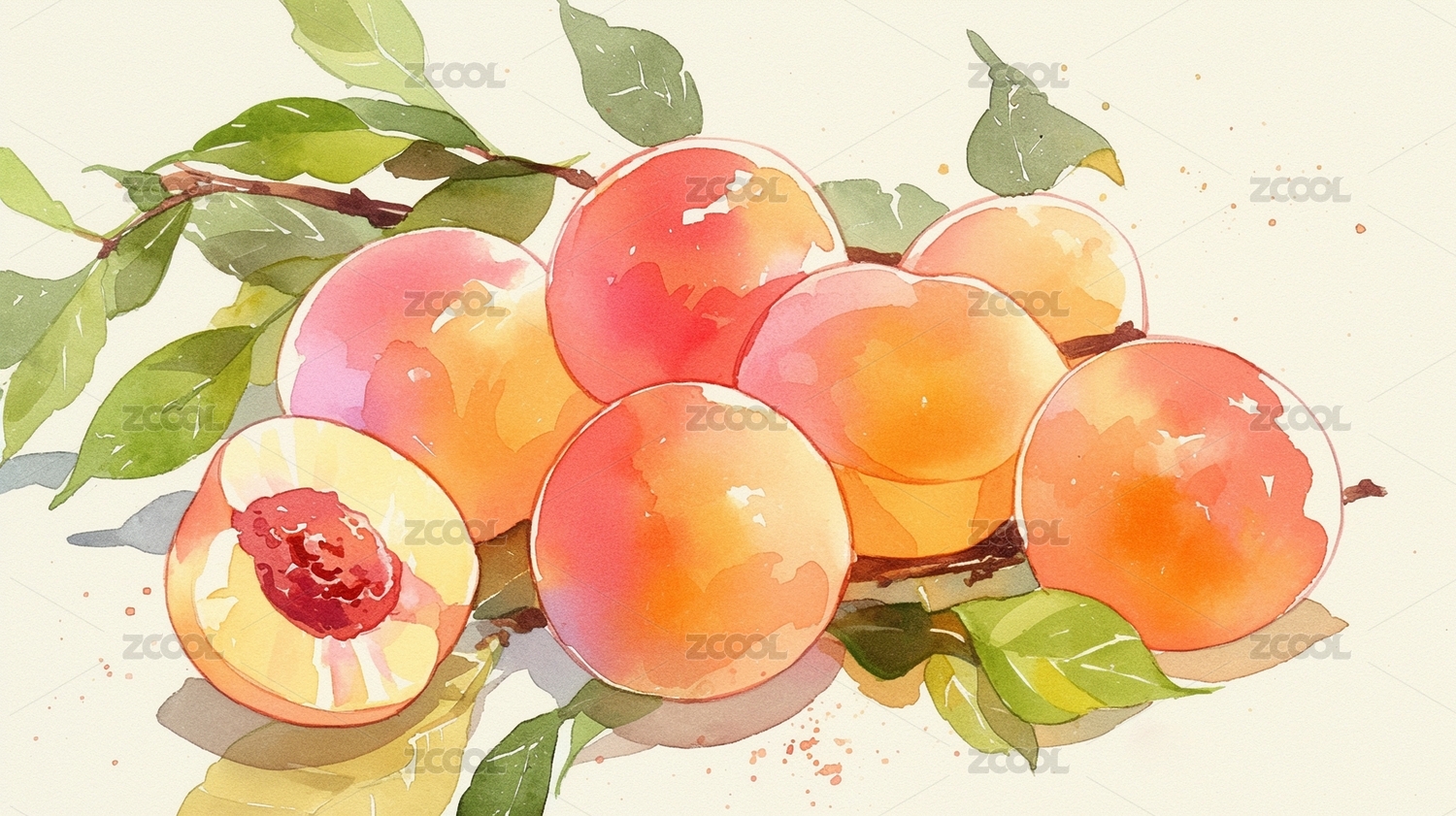 手绘水彩写实风格多汁水蜜桃子水果素材插画