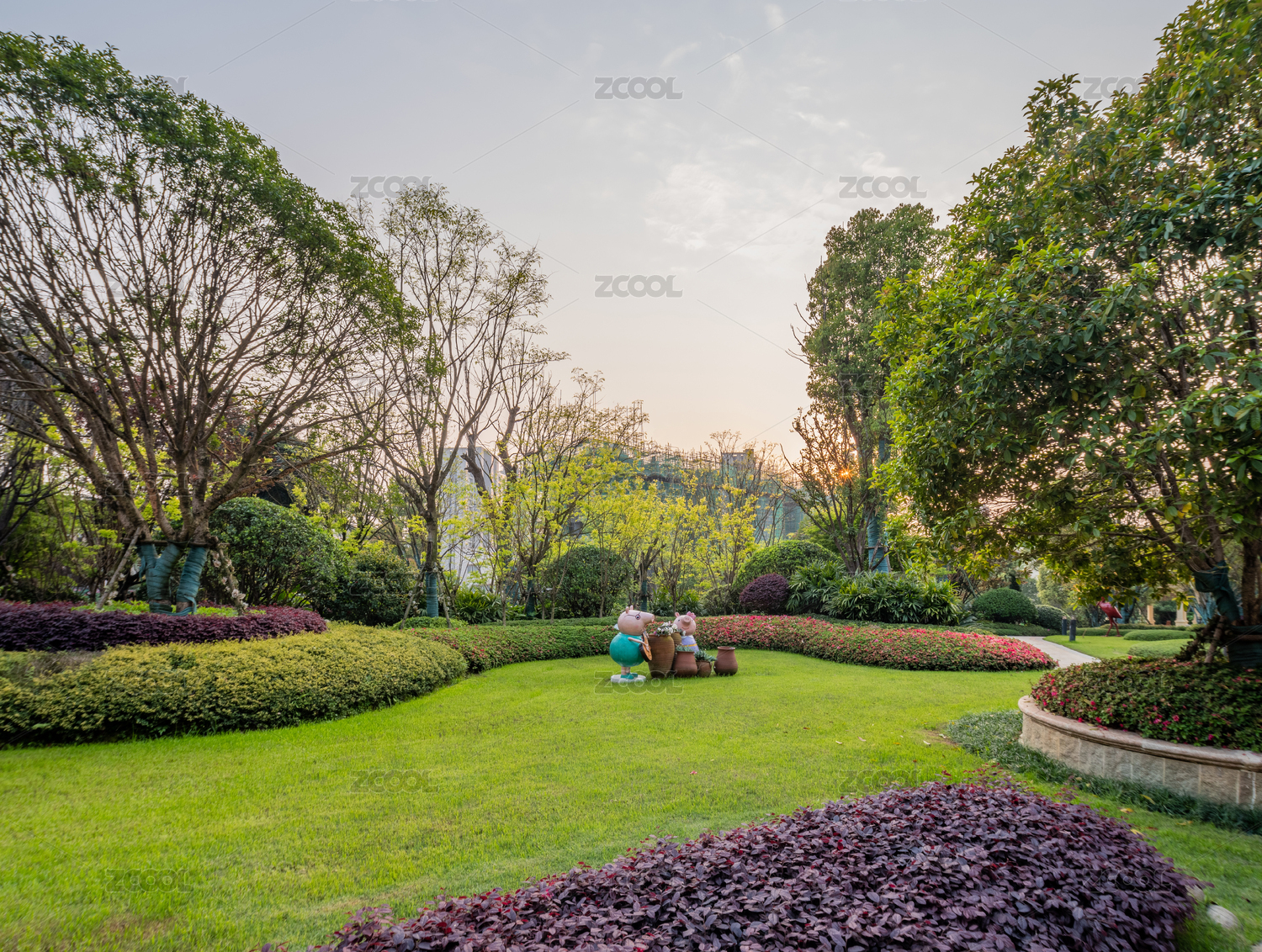 绿色草坪,花园景观,绿草园和花园的曲线人行道