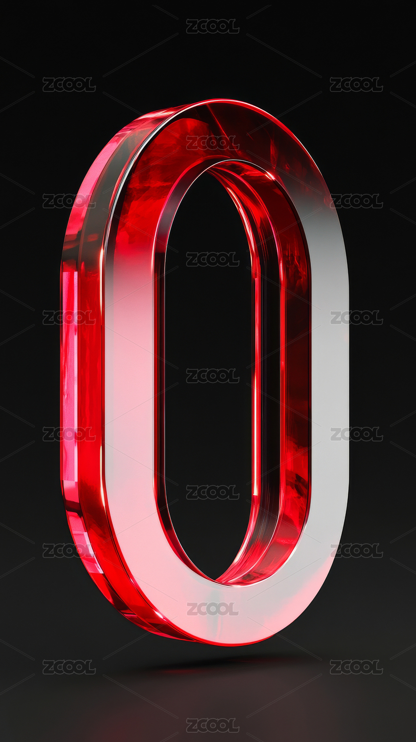 黑色背景上的水晶玻璃透明霓虹发光数字0