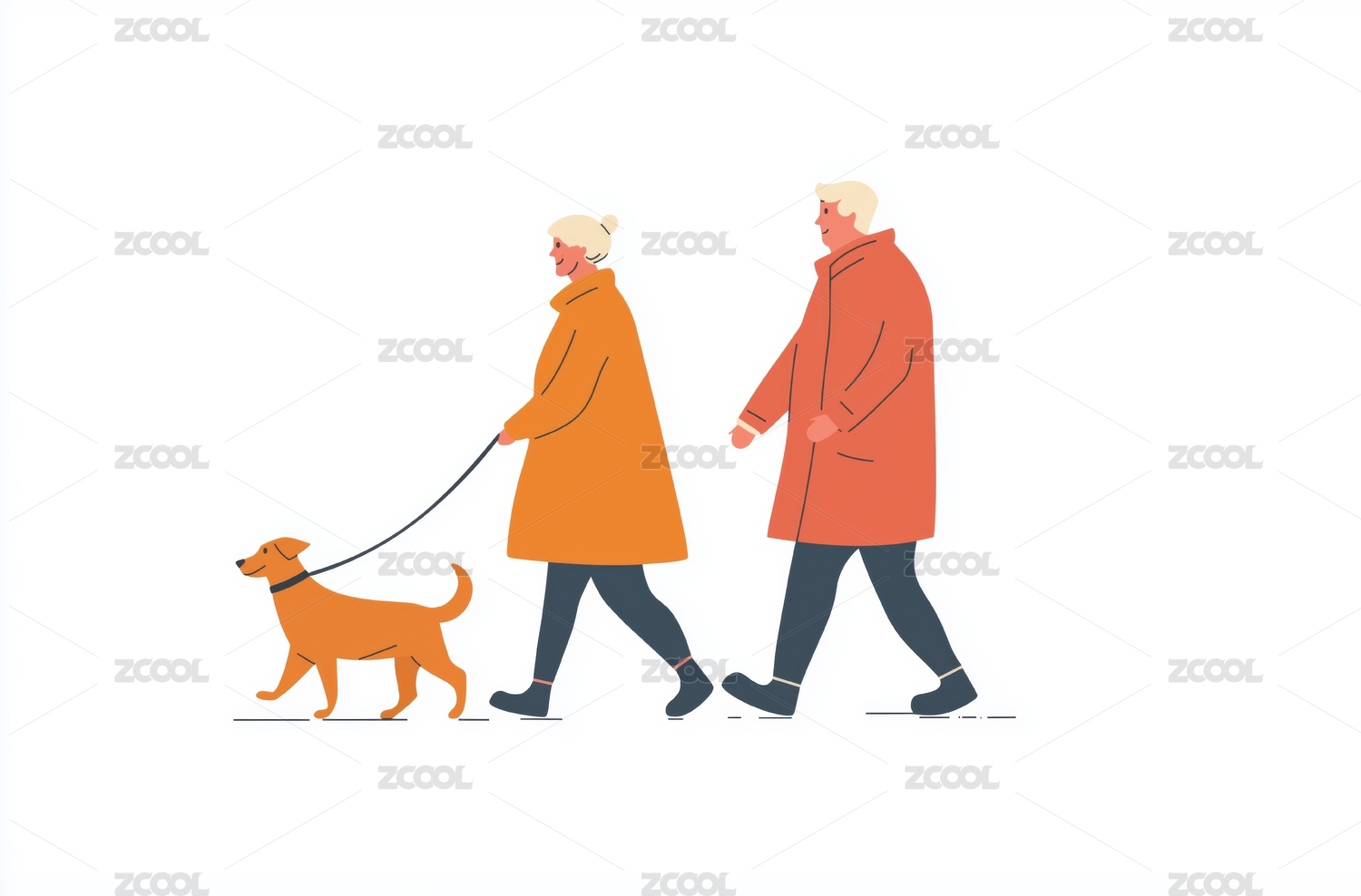 老年人一起遛狗场景插画