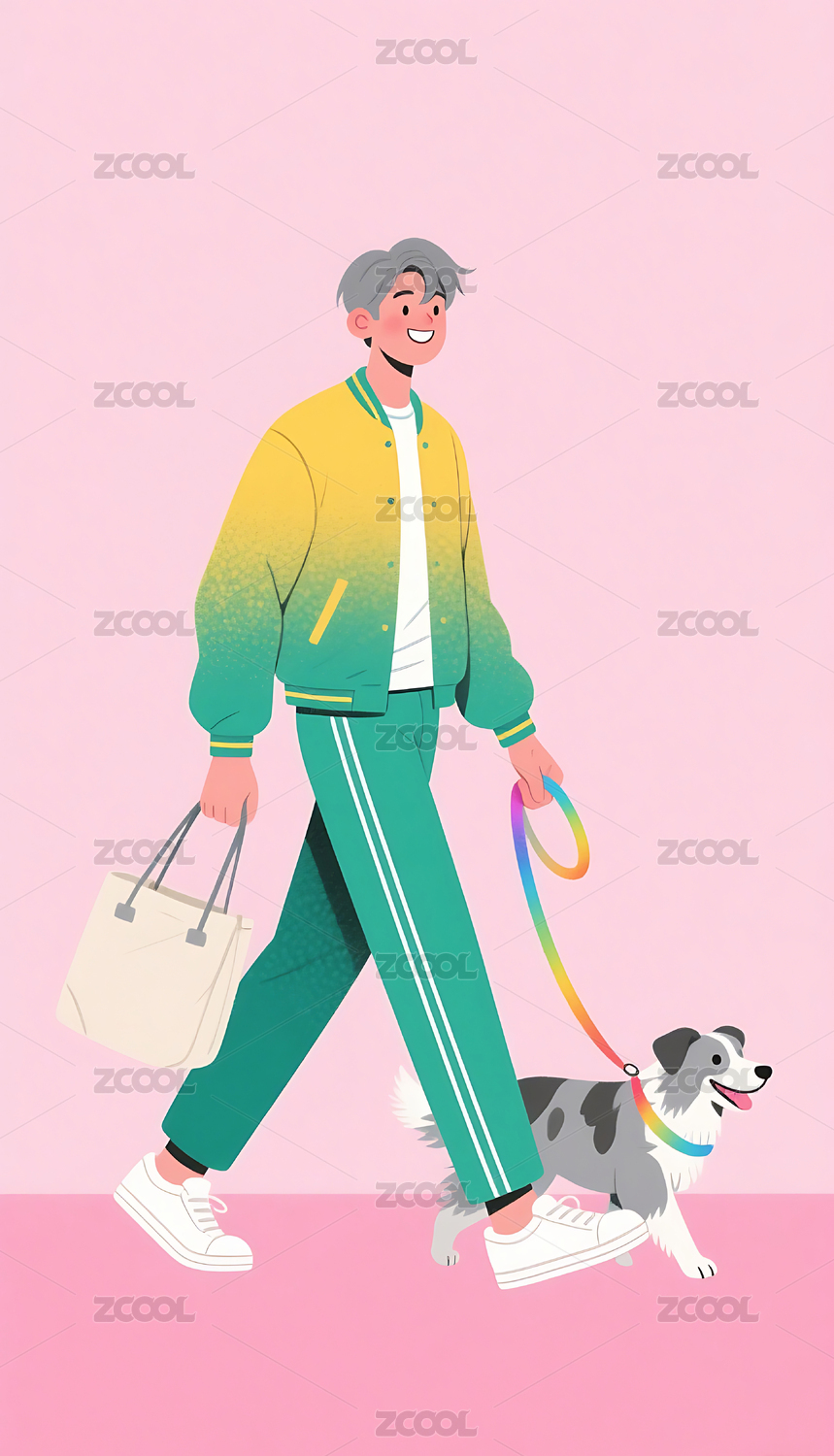 扁平风格美式时尚男生遛狗插画