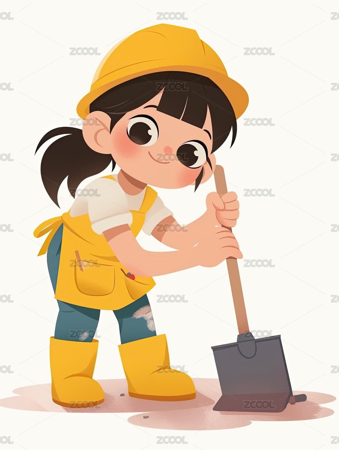 小女孩穿着工作服手持铲子