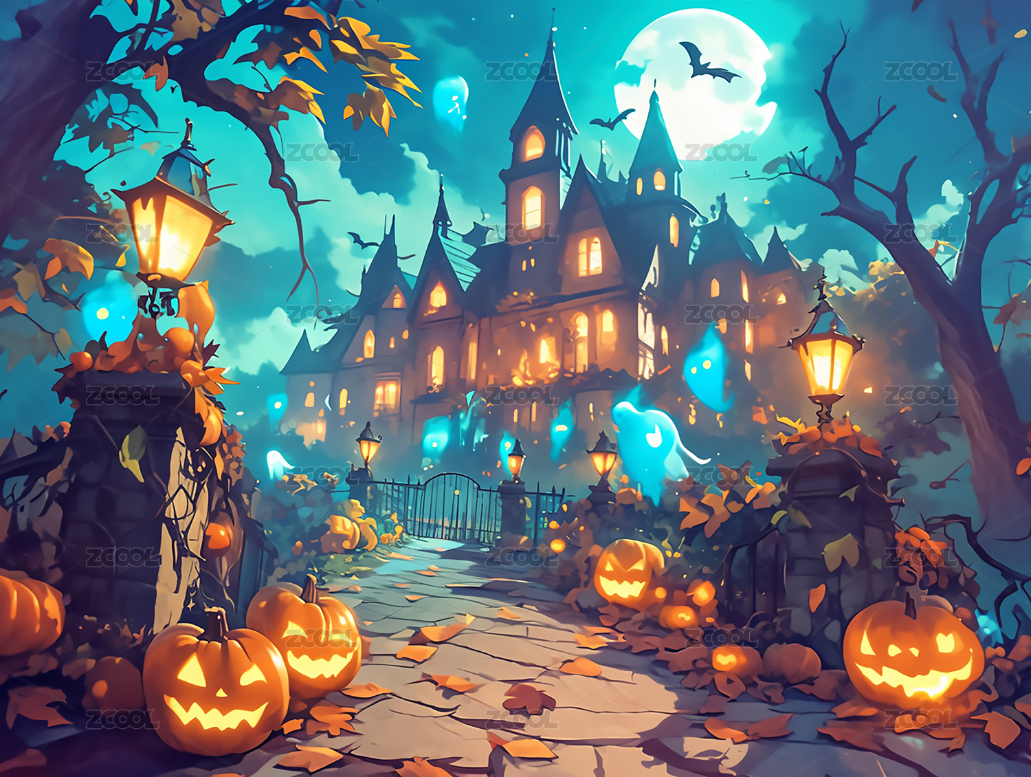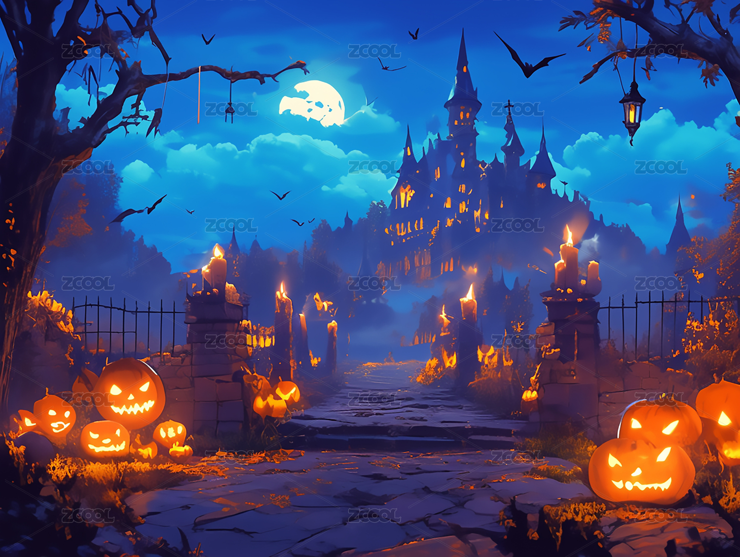 万圣节主题邪恶南瓜城堡插图壁纸背景