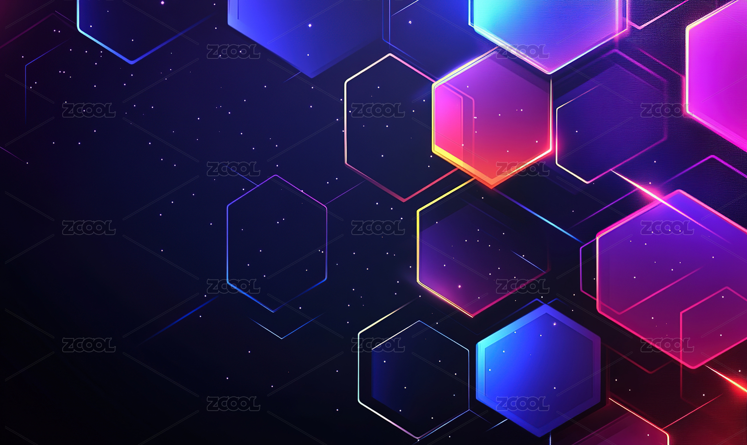 蓝色和粉色霓虹灯光勾勒的六边形背景