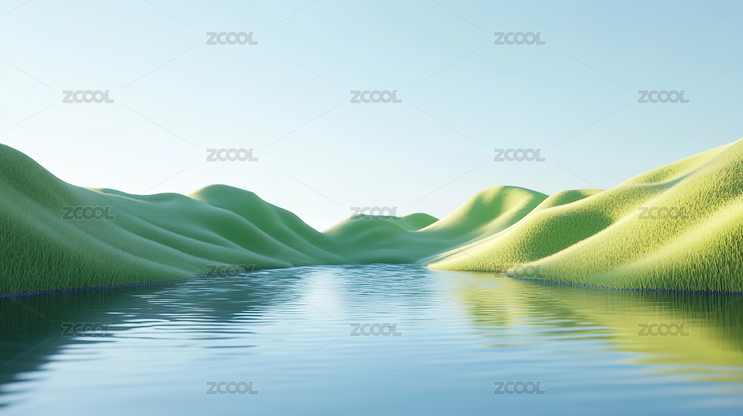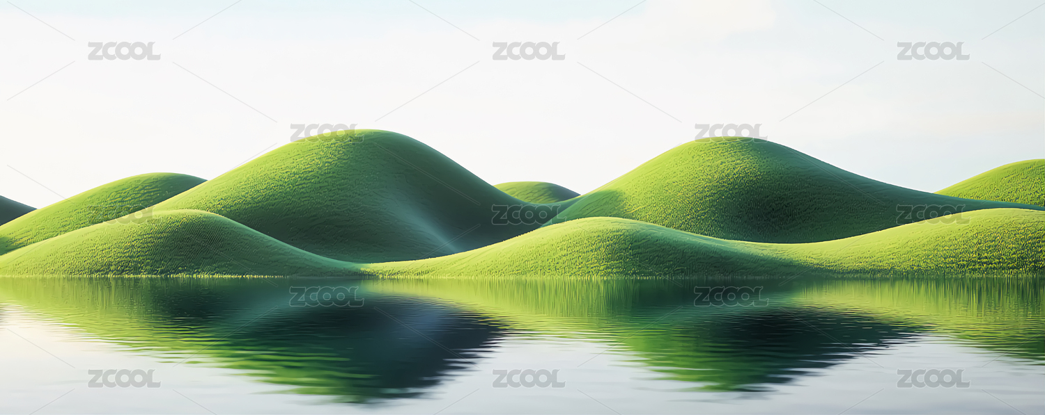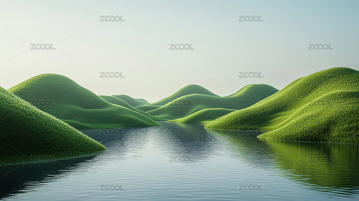 宁静水面的绿色山丘
