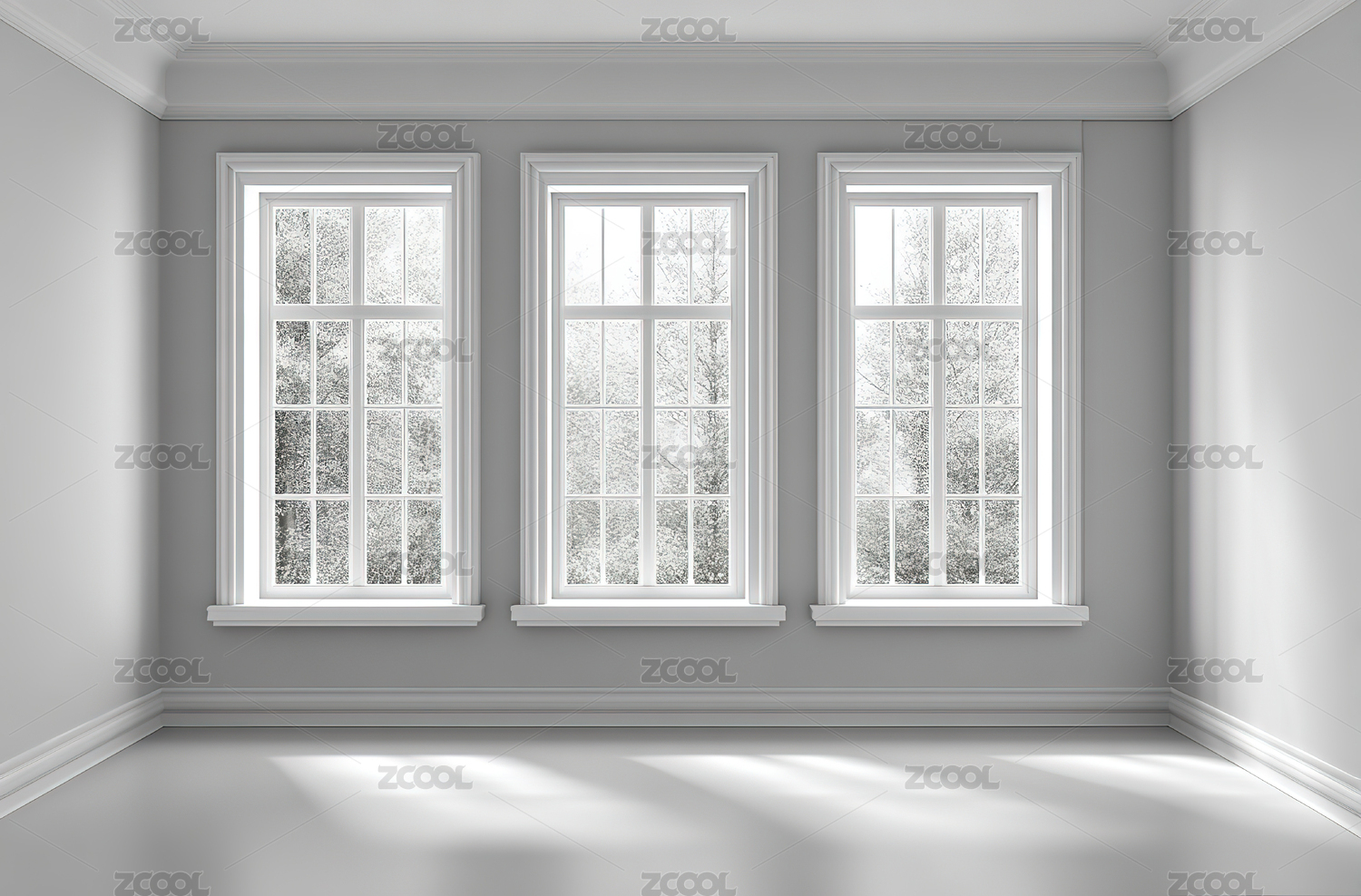 三扇窗户的明亮空房间