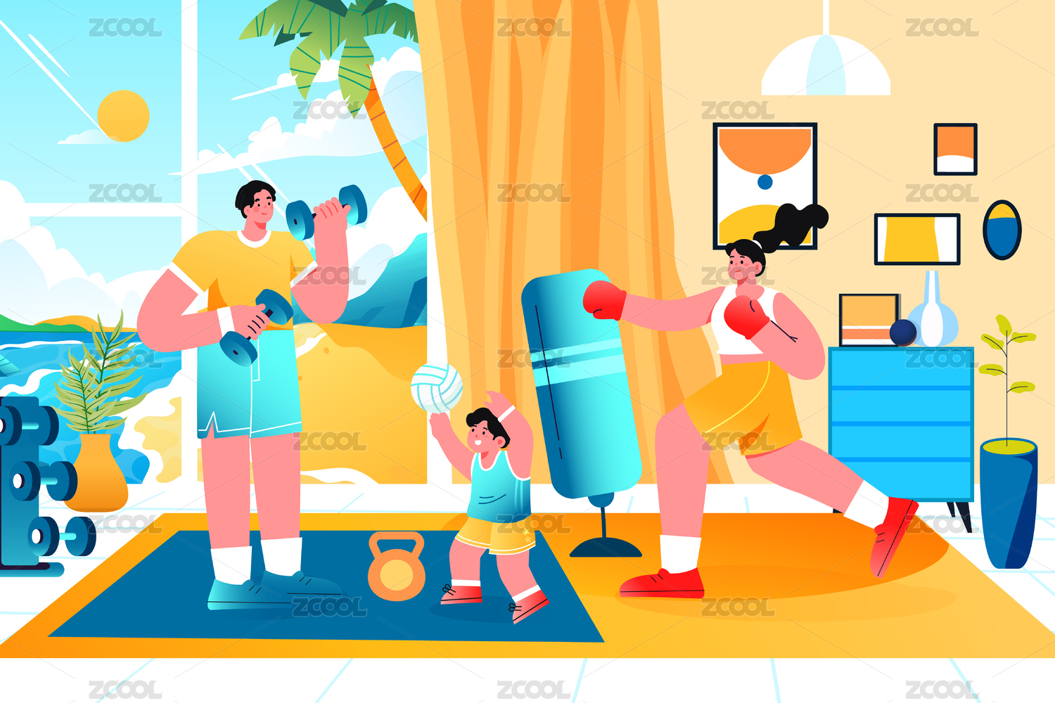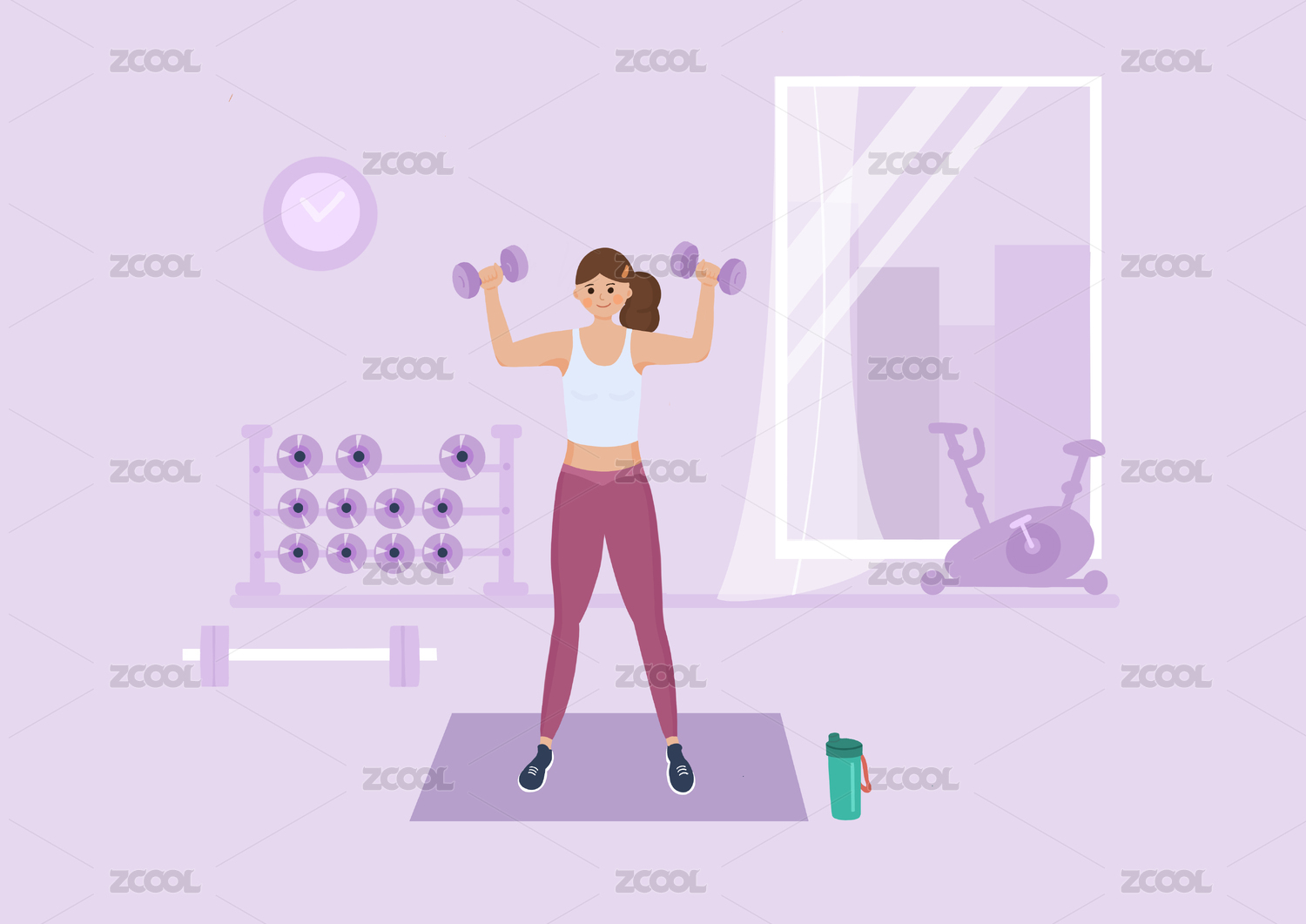 女孩居家隔离瑜伽锻炼健身分层矢量插画