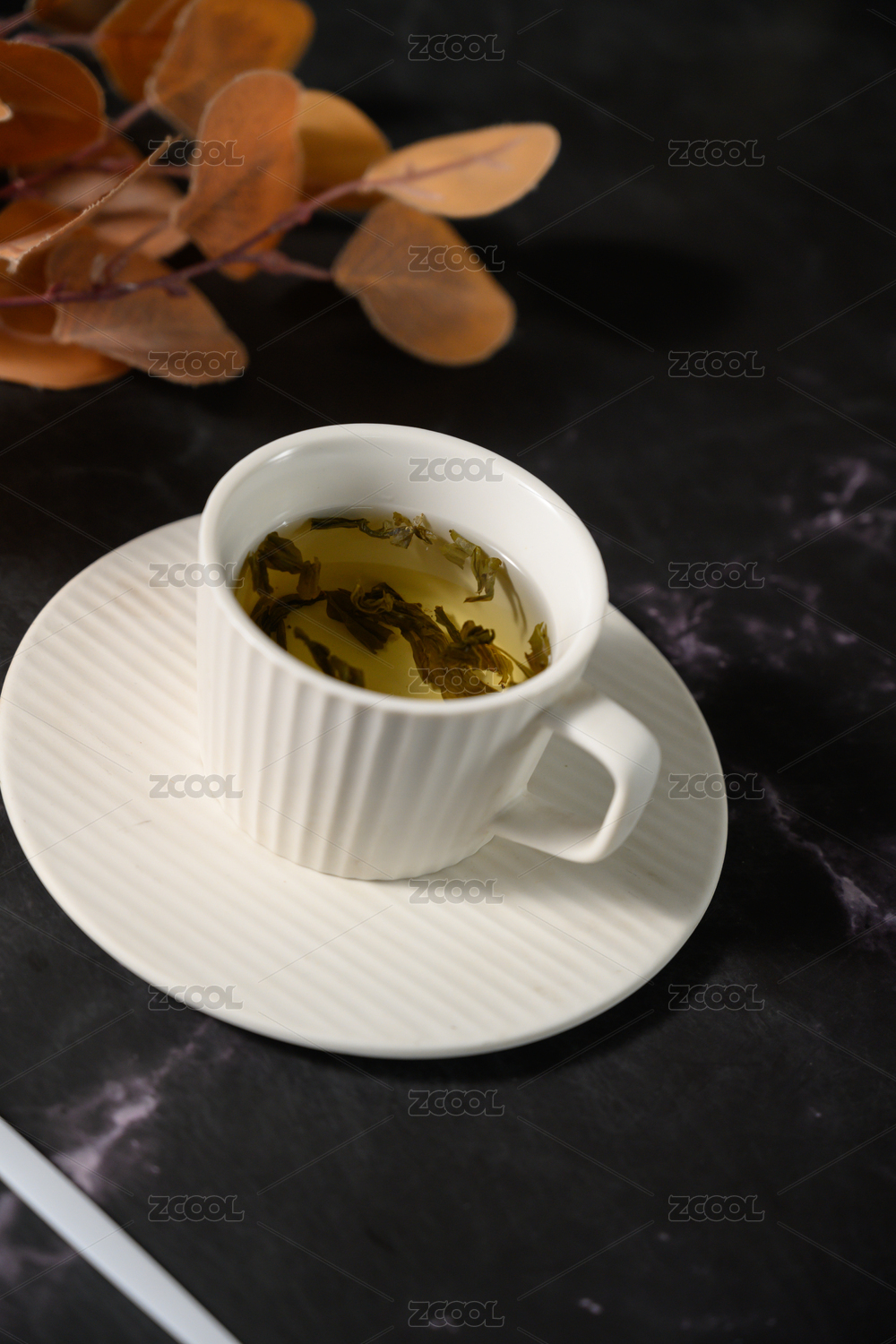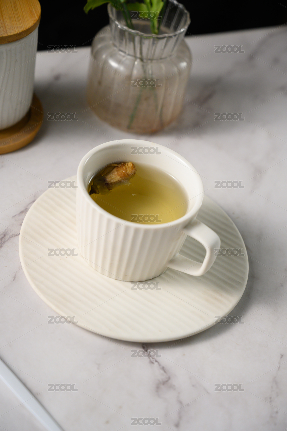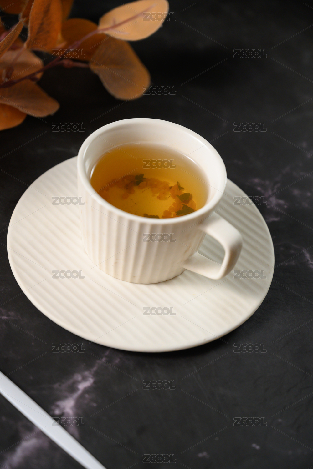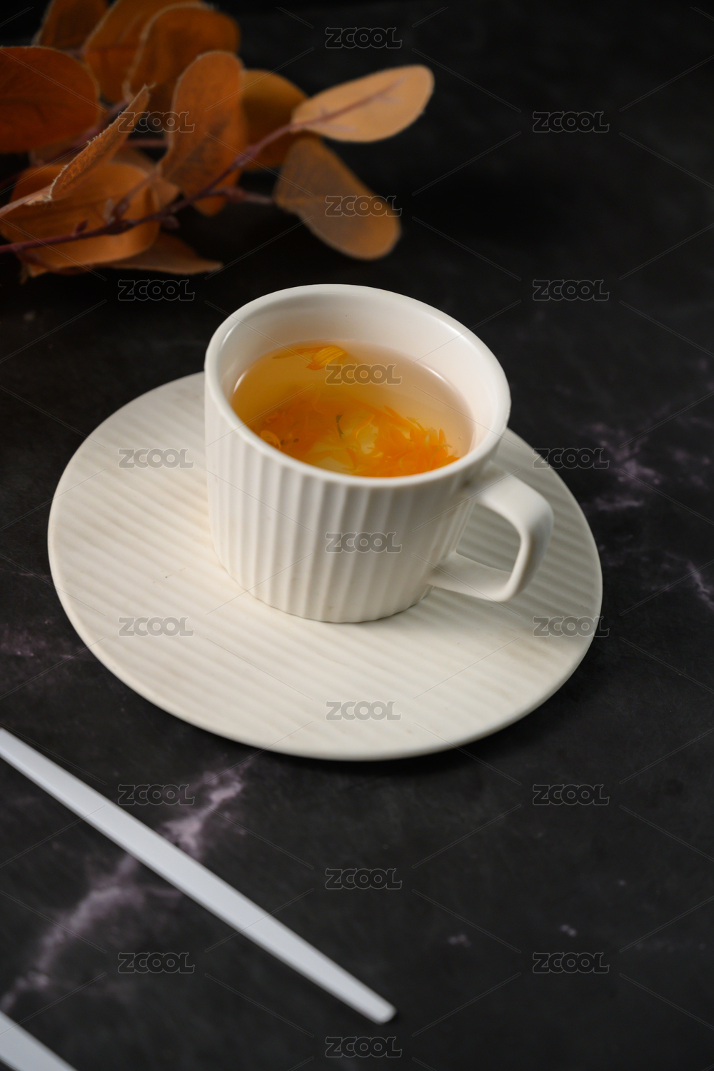 桌面上的杯子里的甘甜可口的金盏菊花茶